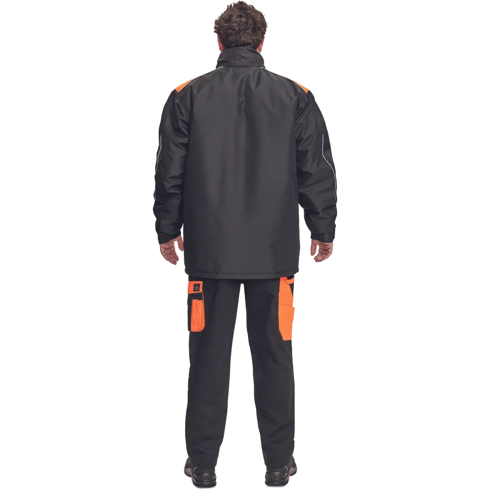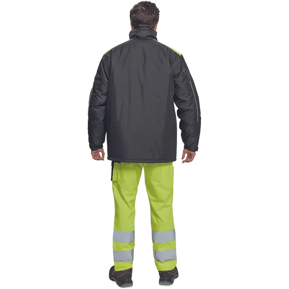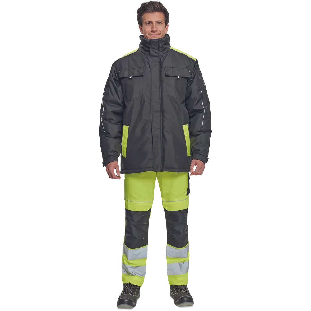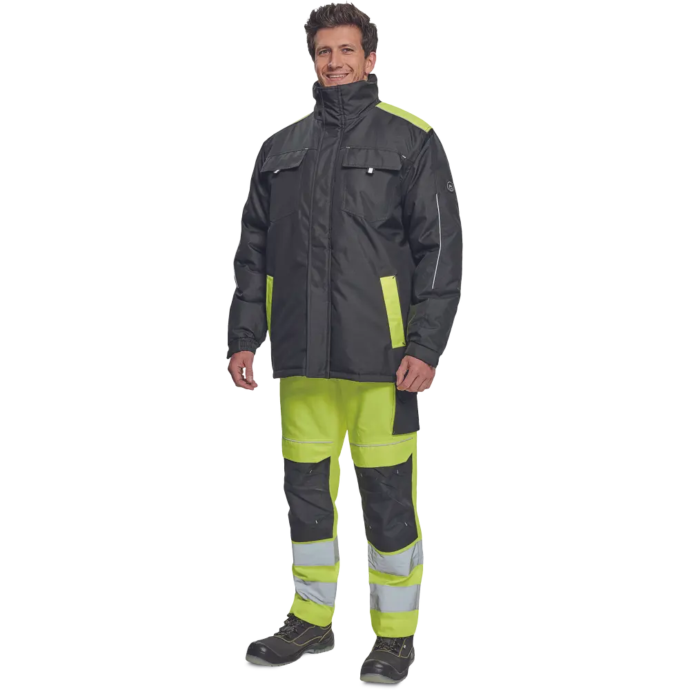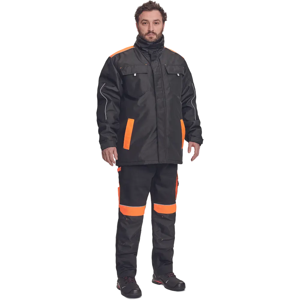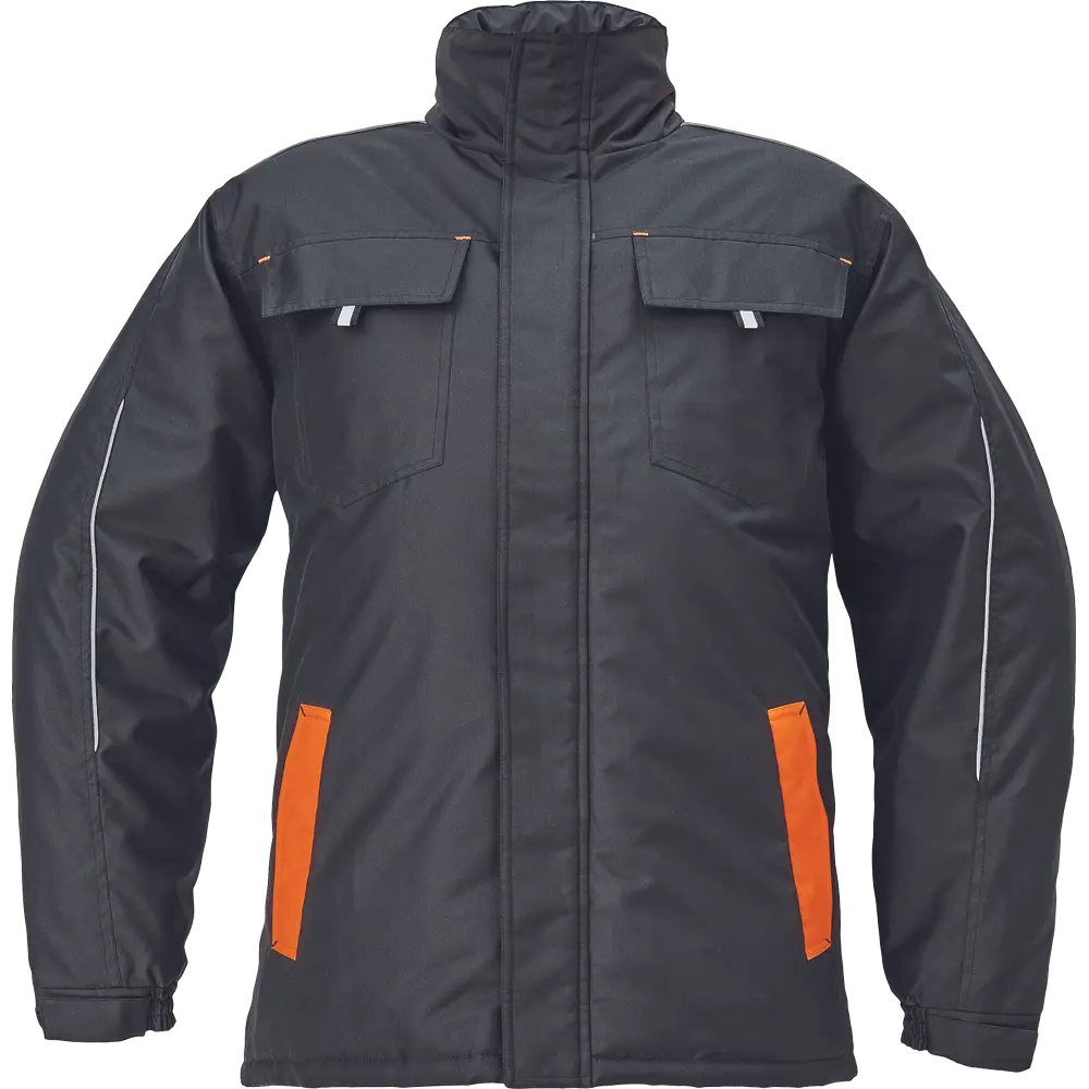 Pánská zimní bunda, zapínání na zip kryté légou na suchý zip, kapuce složená v límci, 2 boční kapsy, 2 náprsní kapsy na suchý zip, 1 vnitřní kapsa na mobilní telefon, elastické manžety rukávů se suchým zipem, reflexní prvky. Normy: EN ISO 13688