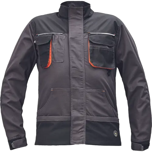 Pánská pracovní bunda, zapínání kryté légou na suchý zip, 2 přední kapsy, 2 náprsní kapsy, 1 náprsní kapsa na mobilní telefon. Oxford 600D zesílení loktů, reflexní prvky, kontrastní prošití. Materiál: svrchní materiál: 65 % polyester , 35 % bavlna, 270 g/m2, svrchní zesílená vrstva: 100 % polyester. Údržba: Perte na 40 °C, běžný prací cyklus, Nebělte. Nesmí se bělit peroxidovými ani chlorovými přípravky, Sušte v sušičce na mírný program, max. teplota sušení 60 °C, Žehlete na nízkou teplotu, maximálně 110 °C, Chemické čištění zakázáno. Norma EN ISO 13688. Velikosti 46-64