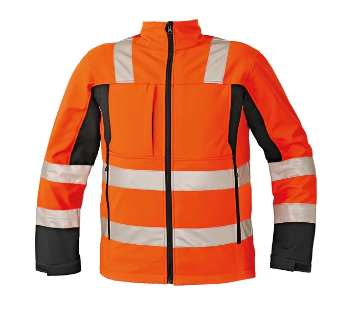 Hi-vis softshellová bunda moderního desigenu se dvěma postranními kapsami, náprsní kapsa na zip, stahání ve spodní části, vodě a větru odolná, zároveň prodyšná