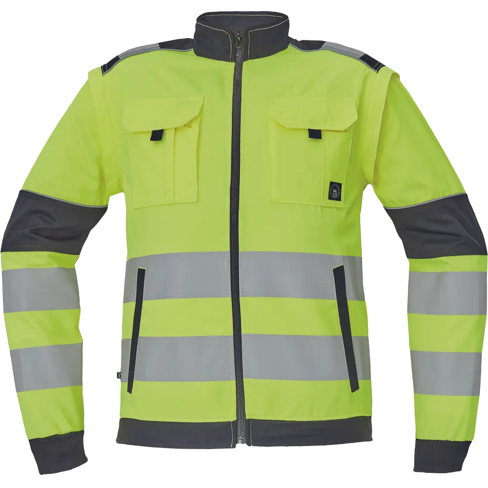 Reflexní bunda pánská HI-VIS pracovní bunda se zapínáním na zip; odepínatelné rukávy; 2 přední kapsy, 2 náprsní kapsy; Oxford 600D zesílení v oblasti ramen; dvojice tištěných 7 cm reflexních pruhů přes zadní obvod pasu a rukávů; 2 menší pruhy přes ramena; reflexní paspulky lemující zesílené části rukávů a ramen; pružné náplety manžet rukávů a elastický spodní obvod pasu. Svrchní materiál: 65 % polyester , 35 % bavlna, 250 g/m2, Svrchní zesílená vrstva: 100 % polyester, OXFORD.