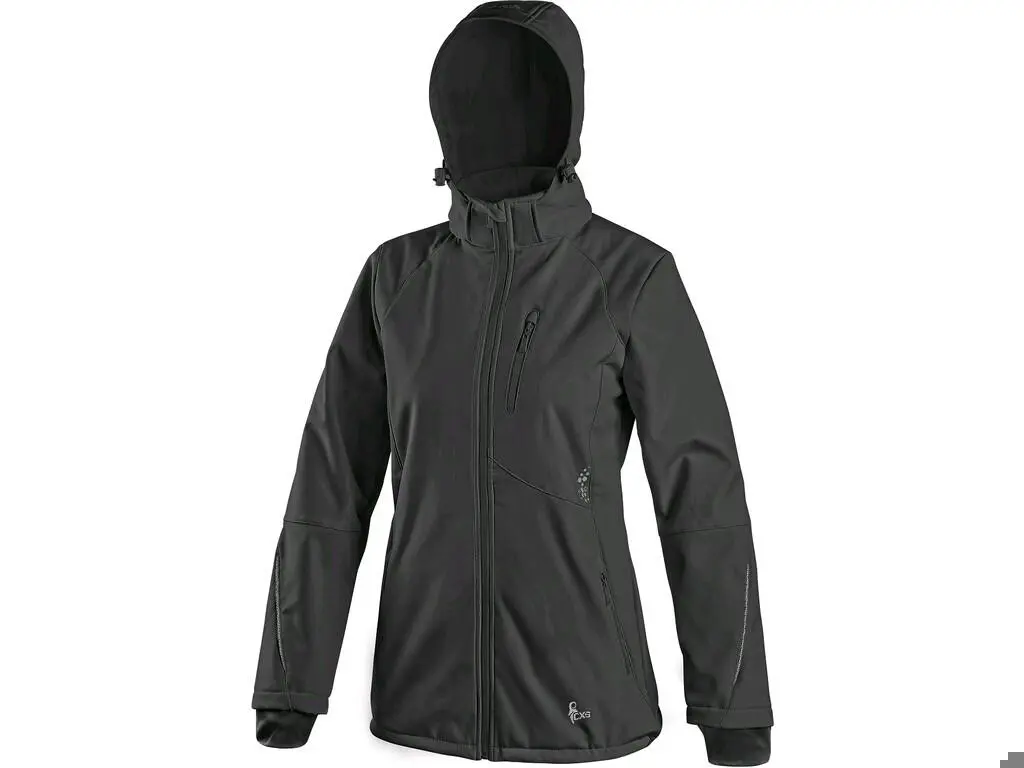 Dámská softshellová bunda s odepínací kapucí, odolná proti vodě a větru, zapínaní na zip, větrání v podpaží, náprsní kapsa na zip, boční kapsy na zip, rukávy s vnitřními manžetami, stahování v dolním okraji, reflexní doplňky, TPU membrána. Odolnost materiálu proti průniku vody 5 000 mm mimo oblast švů, paropropustnost 5 000 g/m2/24h. Svrchní materiál: 96% polyester, 4% elastan. Podšívka: 100 % polyester. Velikosti XS-3XL