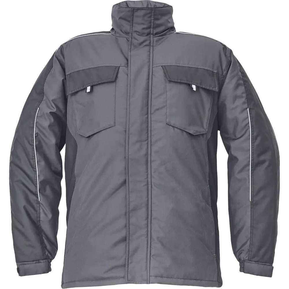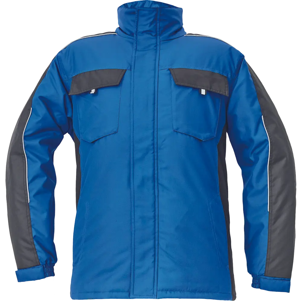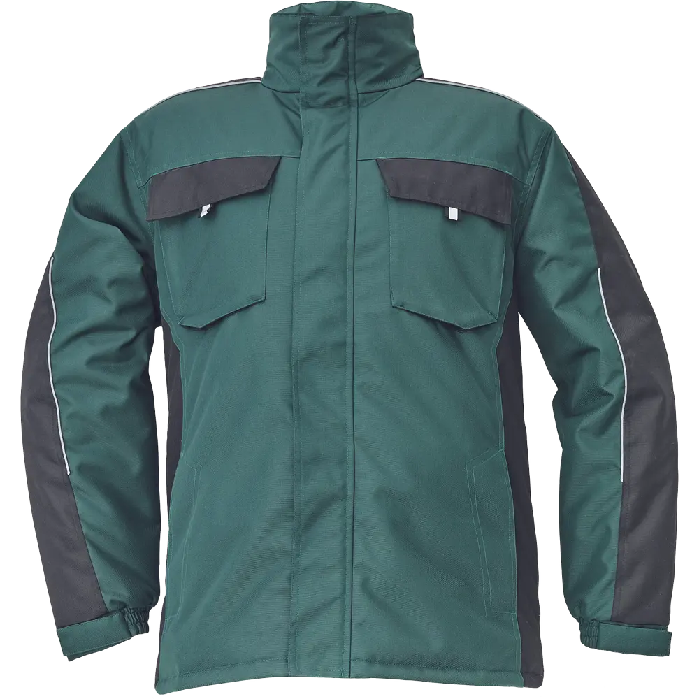 Pánská zimní bunda; zapínání na zip kryté légou na suchý zip; kapuce složená v límci; 2 boční kapsy, 2 náprsní kapsy na suchý zip; 1 vnitřní kapsa na mobilní telefon; elastické manžety rukávů se suchým zipem; reflexní prvky pro zvýšení bezpečnosti uživatele.Materiál: Svrchní materiál: 100 % polyester, Povrstvení: polyuretan. Vnitřní podšívka: 100 % polyester, taffeta. Vnitřní izolace: 100 % polyester, 200 g/m2. Velikosti: S-4XL