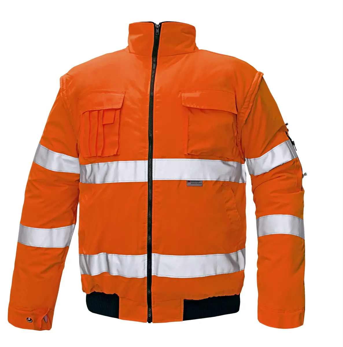 Zateplená reflexní bunda do pasu typu bomber, reflexní pásky 3M, kapuce v límci, nepromokavá, odepínací rukávy, 5+1 kapsa, podlepené švy, polopružný pas.