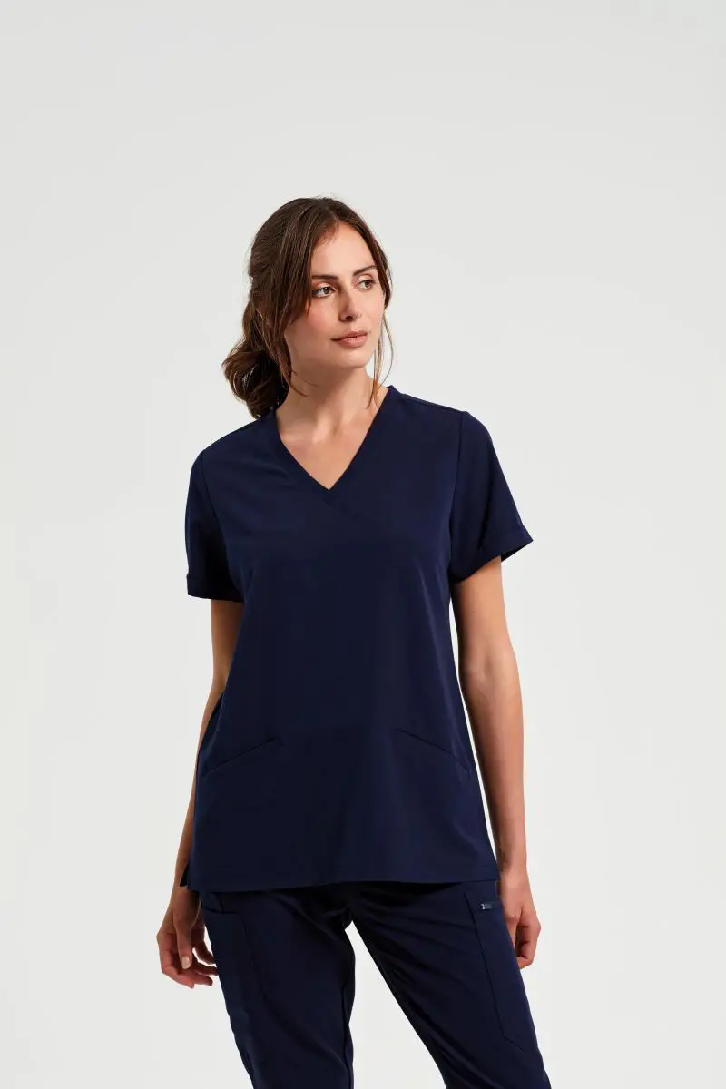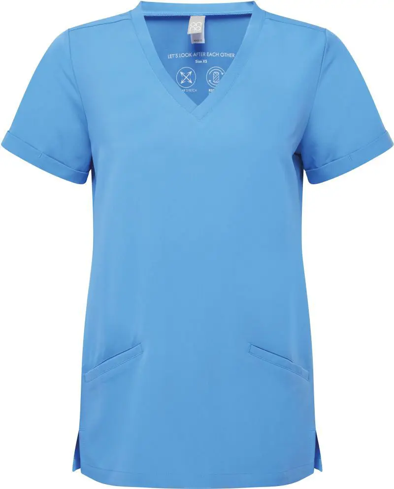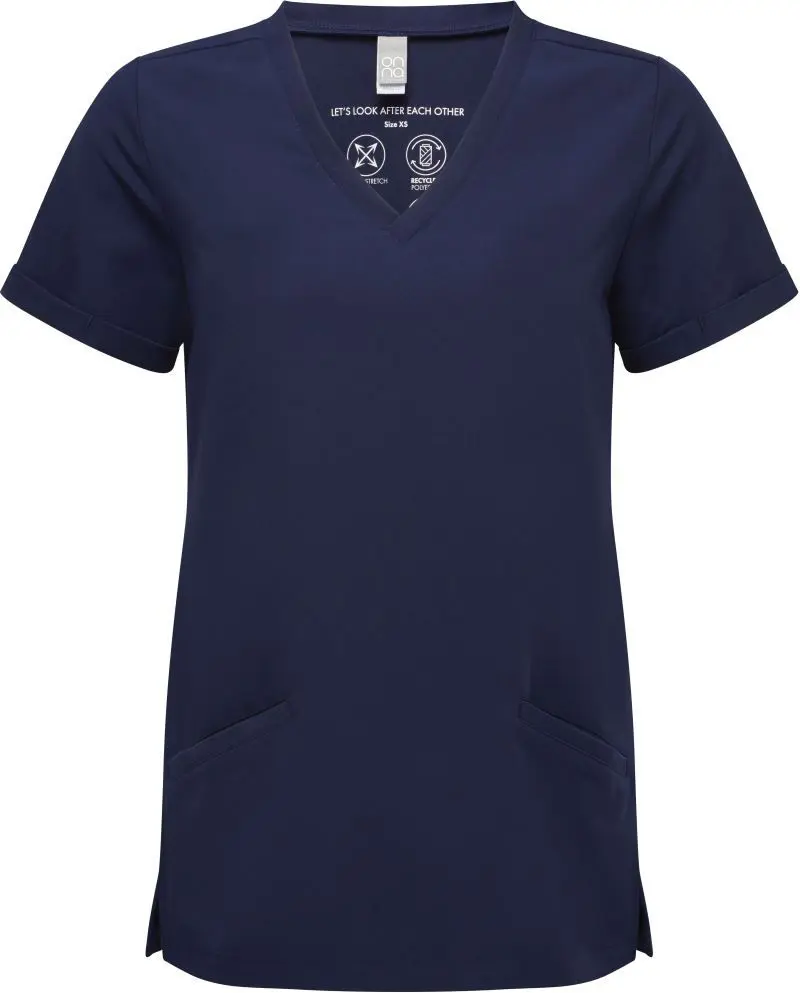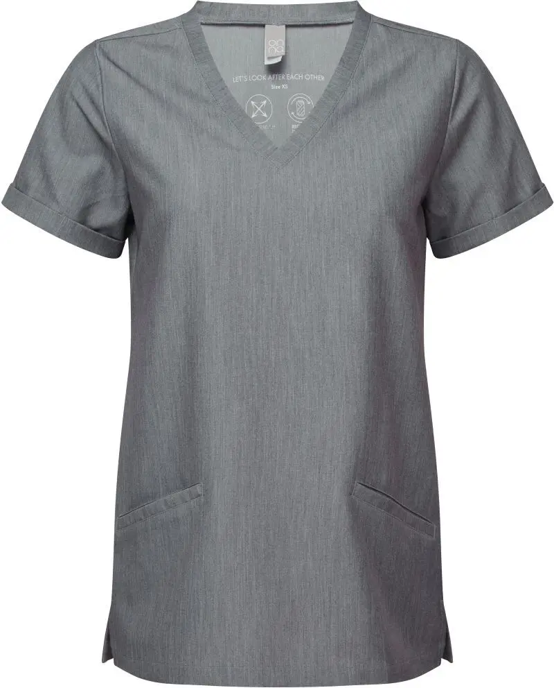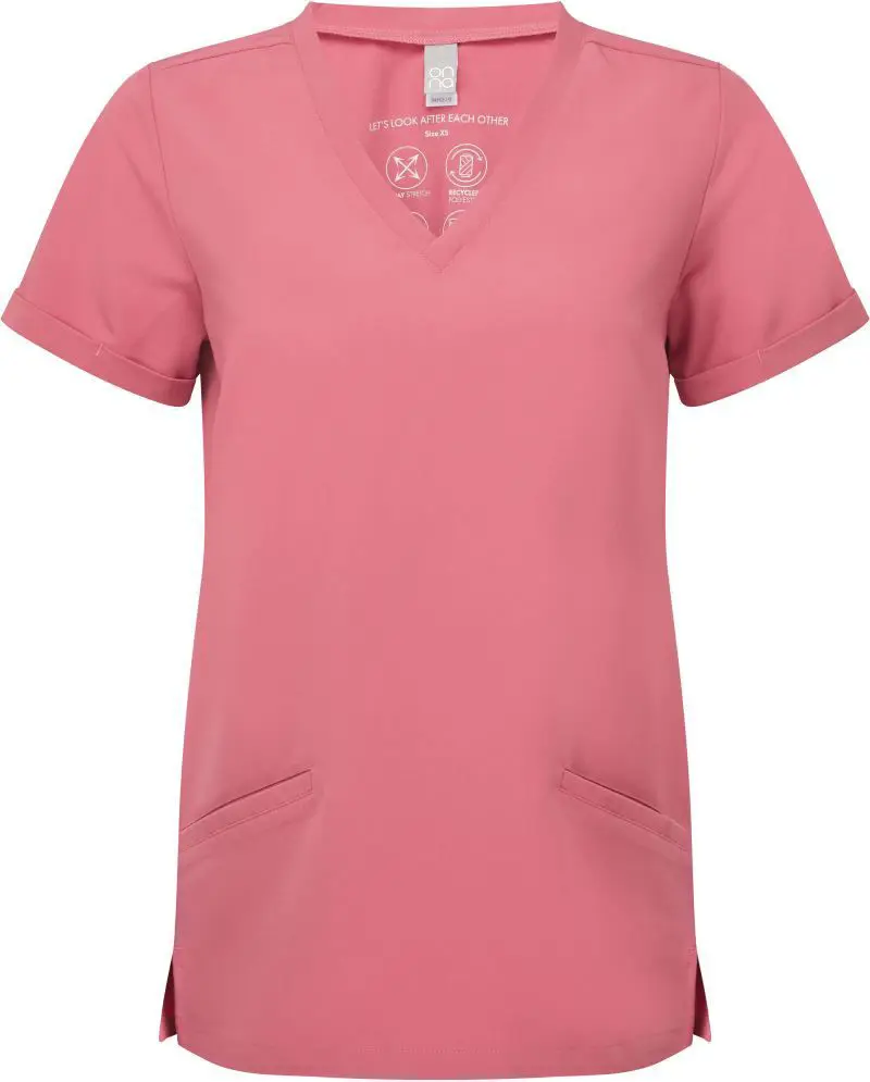 Dámská strečová halena s výstřihem do V. Prodyšný materiál, výstřih do V, 2 přední kapsy, boční rozparky, záševky na zádech, 4-cestný strečový materiál, odolný materiál, nemačkavé, easy care, regulující vlhkost, lze sušit v sušičce při nízké teplotě, nelze chemicky čistit. Složení materiálu 210g/m2, 42% polyester, 33% recyklovaný polyester, 19% viskóza, 6% elastan. Velikosti XS-XXXXXL