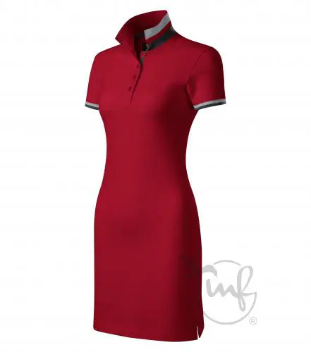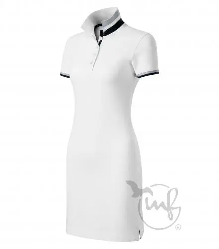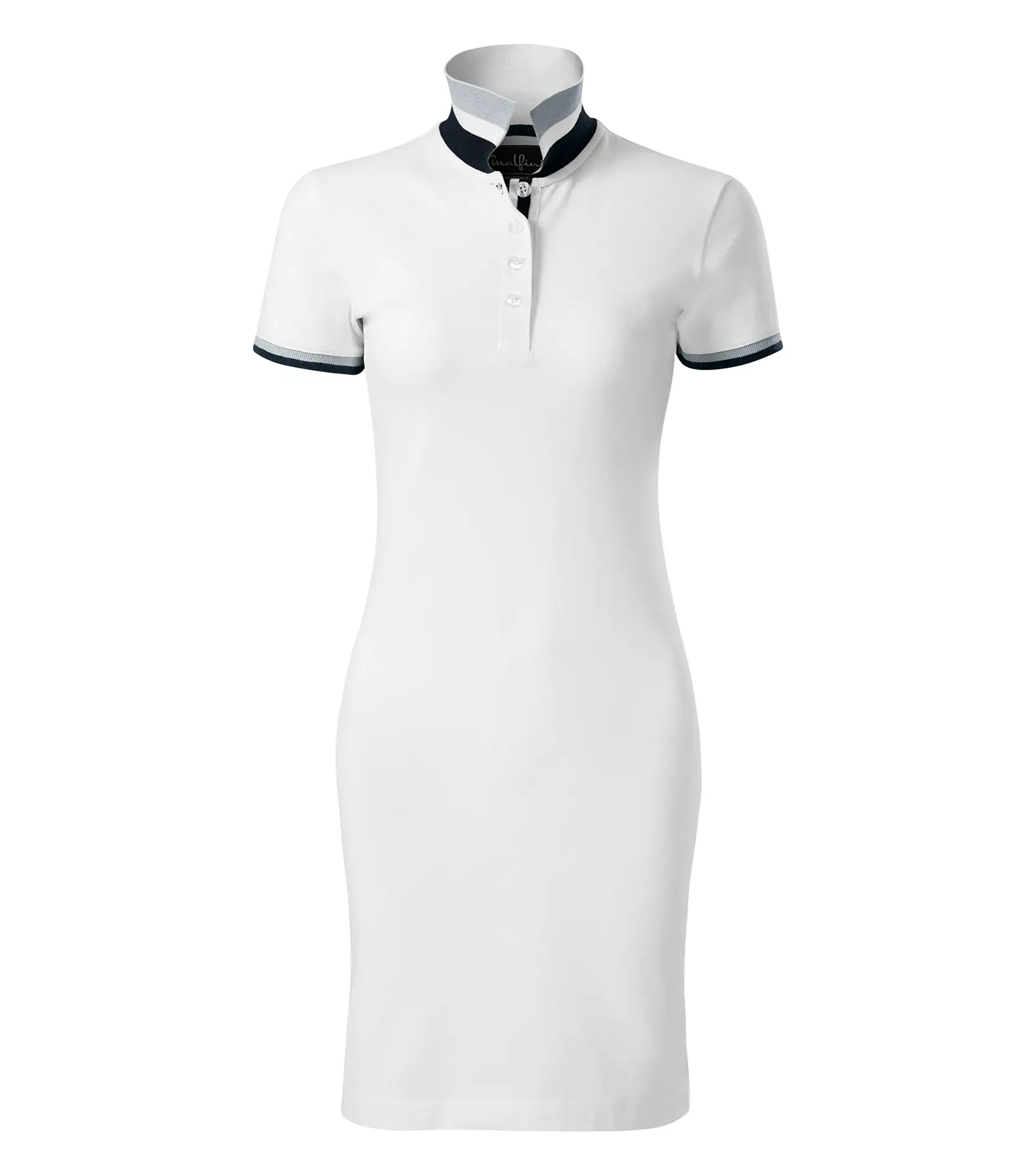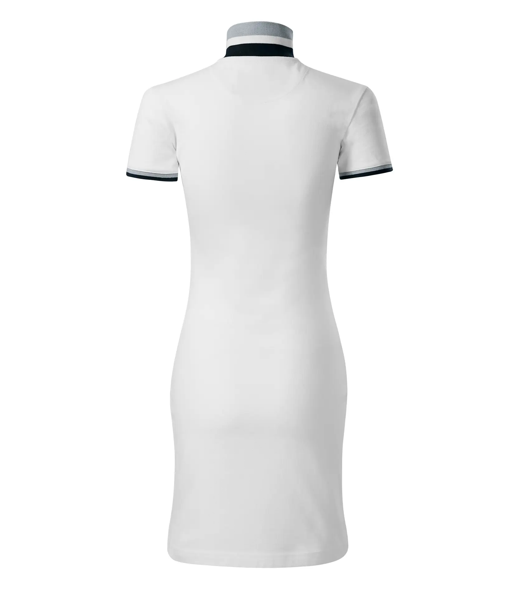 Dámské šaty Dress up, lehce vypasovaný střih s bočními švy, límeček a lemy rukávů z žebrového úpletu 1:1, spodní část límečku a lemy rukávů s kontrastními pruhy, úzká léga s 4 knoflíčky v barvě materiálu, rozparky v bočních švech a spodní léga s kontrastní páskou, vnitřní průkrčník začištěn kontrastní páskou, zpevnění ramenních švů páskou. 100 % bavlna, 215 g/m2, pratelné na 40 °C. Velikosti: XS - 2XL