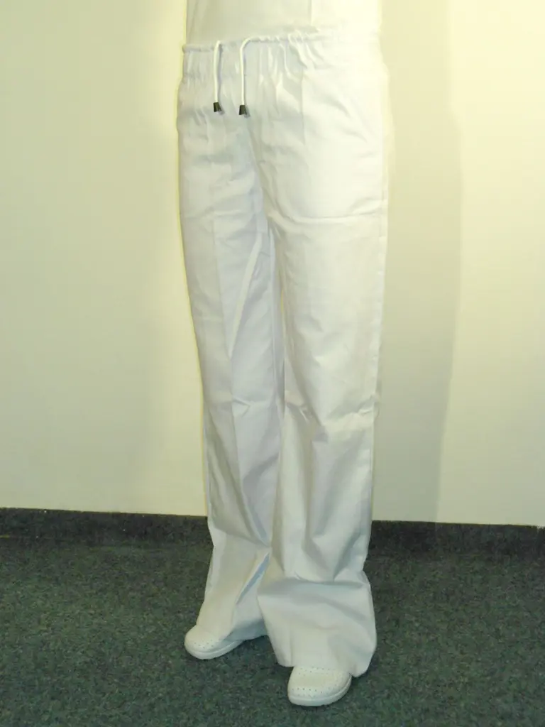Kalhoty bavlněné dámské na gumu v pase a šňůrku, nový a velmi pohodlný rovný střih, dvě boční kapsy, materiál 100% vzdušná bavlna, tyto kalhoty lze využít jak ve zdravotnictví tak v gastronomii. Kalhoty jsou šité na průměrnou výšku 170cm