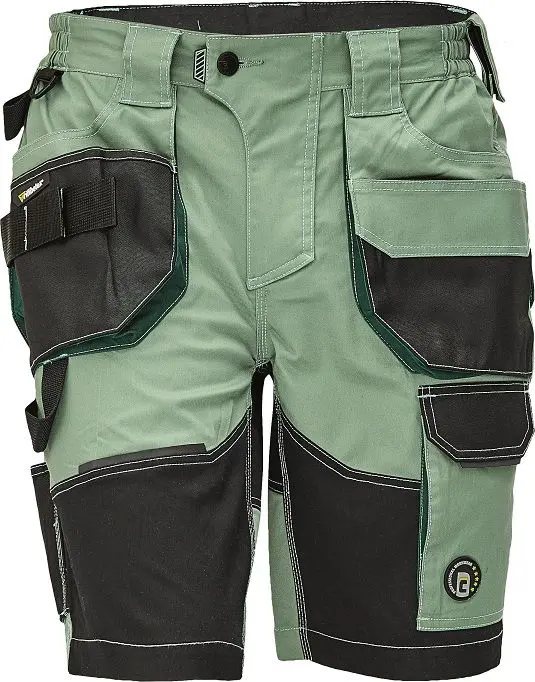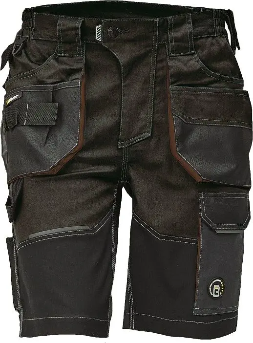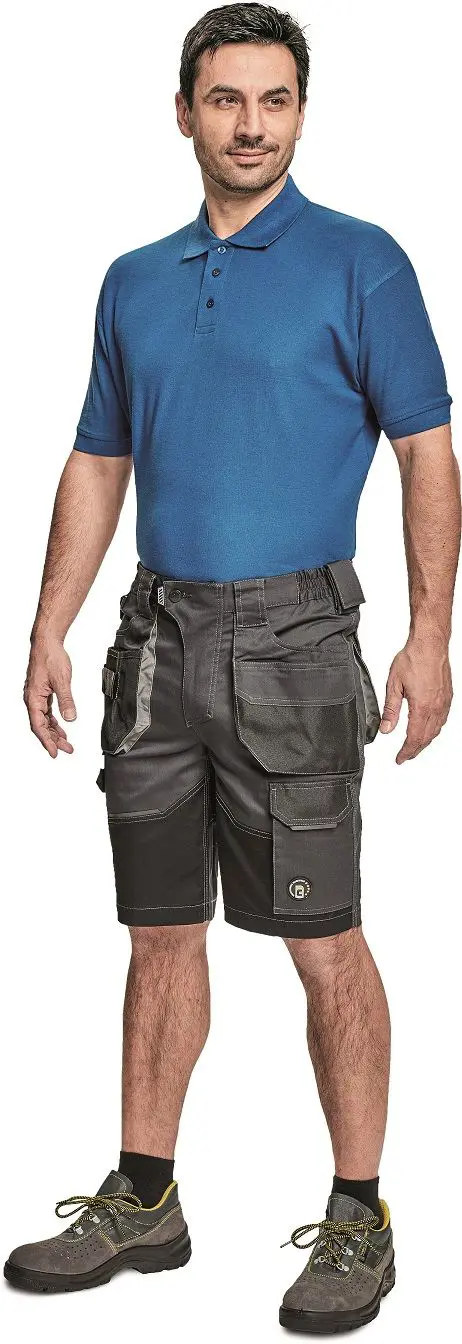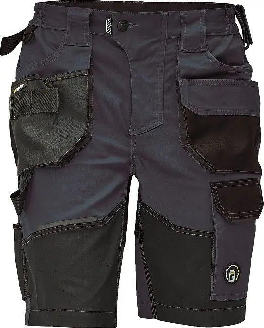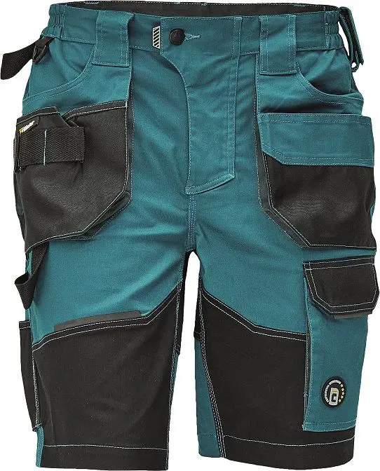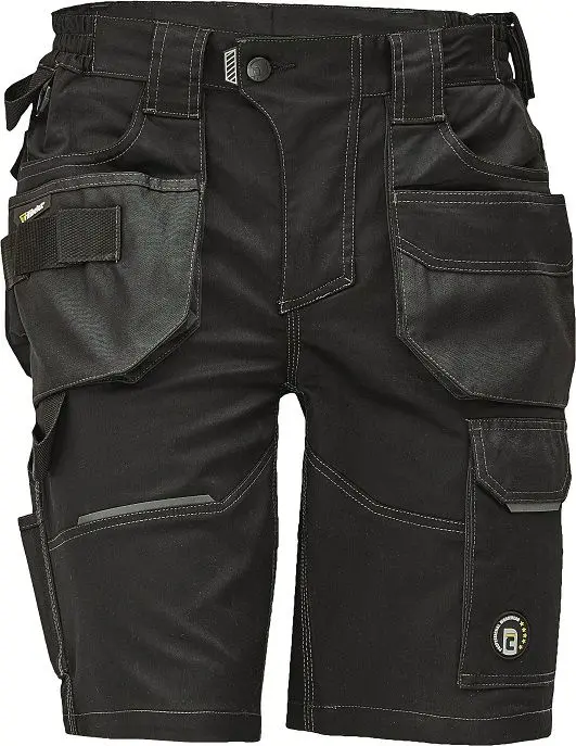 Pánské pracovní šortky; elastický inovativní materiál TRIFIBETEX; ergonomický střih; snížený pružný pas; odolné trojité prošití nohavic a sedu; prostorné multifunkční přední kapsy s poutky na nářadí; 2 zadní kapsy s klopou zesílené Oxfordem; stehenní kapsa na telefon s klopou a zapínáním na suchý zip; kapsa na metr a nůž; poutko na kladivo; "D" kroužek; poutko nanářadí v pase; originální zpracování zapínání kalhot; reflektivní prvky v barevném odstínu