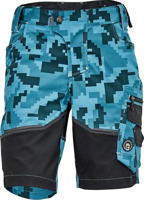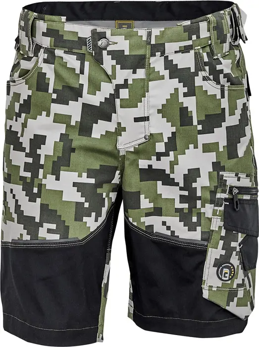 Pánské pracovní šortky, elastický inovativní materiál TRIFIBETEX® v přírodním maskování, ergonomický střih, snížený pružný pas, odolné trojité prošití nohavic a sedu, prostorné multifunkční přední kapsy s poutky na nářadí, 2 zadní kapsy na suchý zip, stehenní kapsa na telefon s klopou a zapínáním na suchý zip, kapsa na metr a nůž, poutko na kladivo, "D" kroužek, poutko na nářadí v pase, originální zpracování zapínání kalhot, reflektivní prvky v barevném odstínu.Materiál: 2 % polyester, 98 % TRIFIBETEX. Velikosti: 46-64