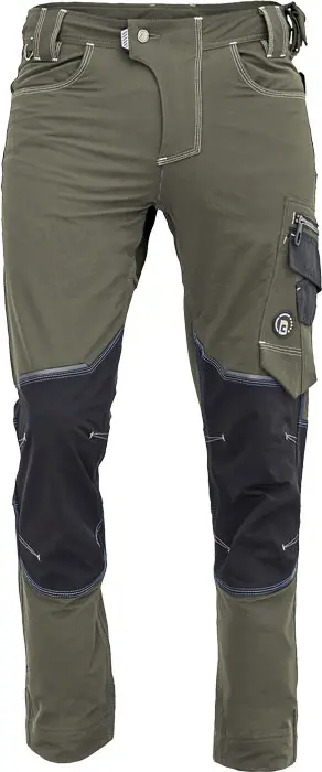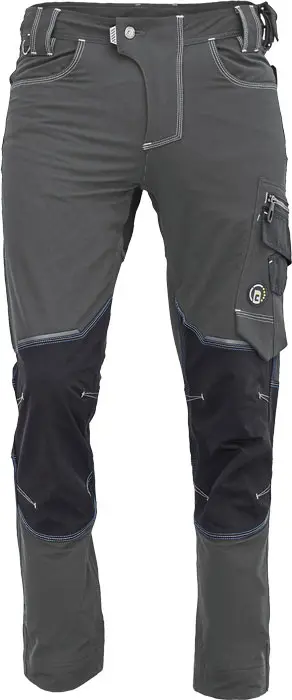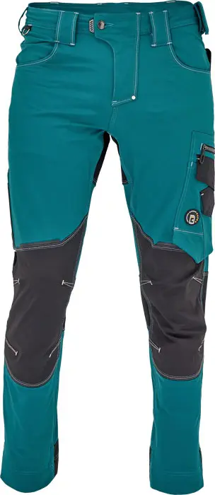 Pánské pracovní kalhoty, elastický inovativní materiál TRIFIBETEX PRO®, slim střih, snížený pružný pas, odolné trojité prošití nohavic a sedu, CORDURA zesílená oblast kolen, prostorné multifunkční přední kapsy s poutky na nářadí, 2 zadní kapsy, stehenní kapsa na telefon s klopou a zapínáním na suchý zip, kapsa na metr a nůž, poutko na kladivo, "D" kroužek, poutko na nářadí v pase, originální zpracování zapínání kalhot, reflektivní prvky v barevném odstínu, nastavitelná délka nohavic. Materiál: 90 % polyamide (nylon), TRIFIBETEX-PRO, 240 g/m2, 10 % elastane. Velikosti: 46-64