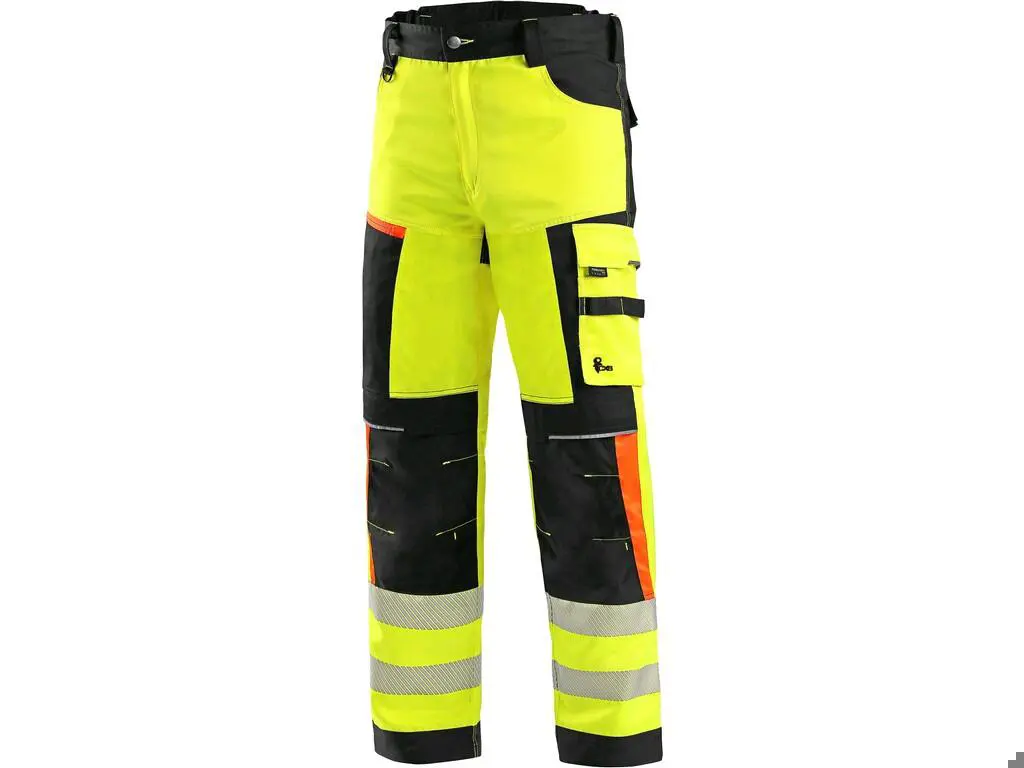 Pánské výstražné kalhoty, pas s poutky na opasek a gumou v bocích, 2 přední kapsy, 2 zadní kapsy, jedna s klopou, kryté přední zapínání na zip, boční multifunkční kapsy, stehenní zipová kapsa s vnitřním pouzdrem na ID kartu, kolena zesílena materiálem CORDURA s možností vložení kolenních výztuh, spodní část nohavic vyztužena materiálem CORDURA, segmentované reflexní pásky (šíře 7 cm), kontrastní oranžové a reflexní doplňky. Materiál: satén 60%,bavlna 40%,polyester, doplňkový kepr 60%,bavlna 40%,polyester, 280 g/m2. Velikosti: 48-68