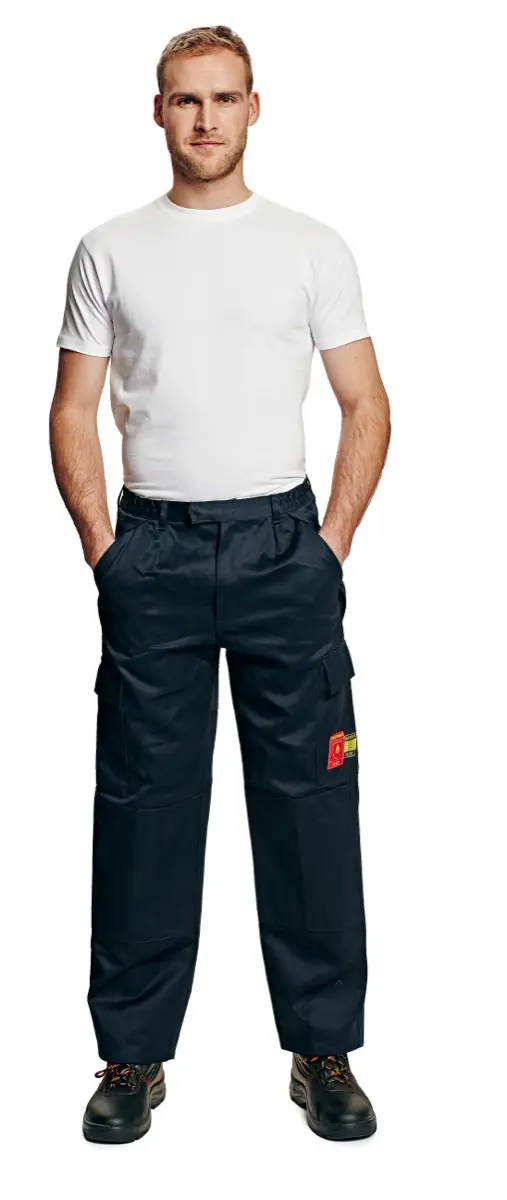 Antistatické kalhoty do pasu s nehořlavou úpravou na bázi probanu, 100% bavlna, 360 g/m2, poutka na opasek, mnoho kapes, zesílená kolena a sed