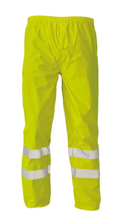 Hi-Vis nepromokavé kalhoty s reflexními pruhy, v pase pruženka na gumu, spodní lem nohavic ke stažení na plastové druky, podlepené švy