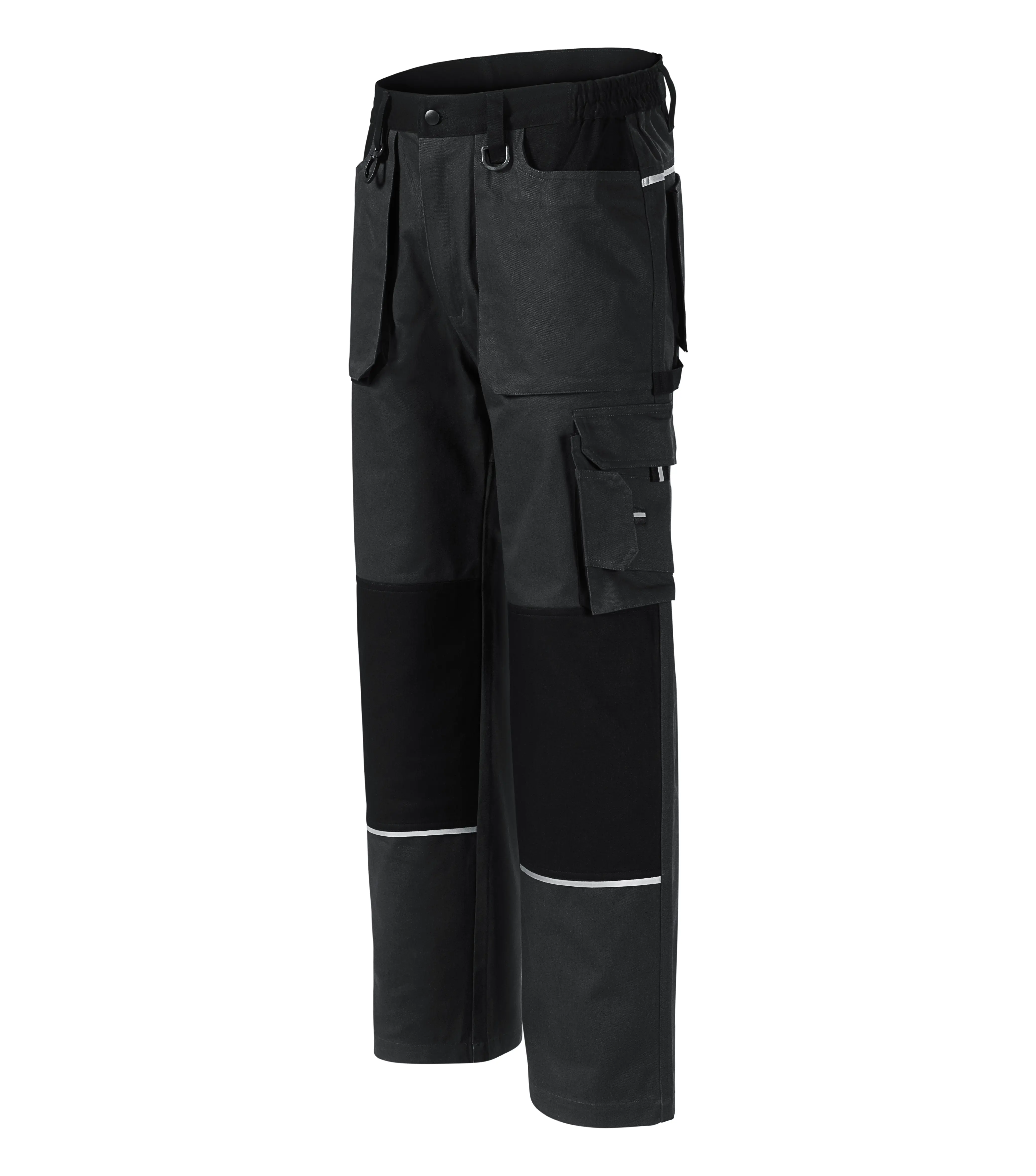 Pracovní kalhoty pánské z Kepru 100 % bavlna, pruženka v boční části pasového límce, 7 multifunkčních kapes, zdvojený materiál v oblasti kolen a sedu, plastové "D" poutko a karabina na klíče a ID karty, poutko na kladivo, dvojité prošití pro vyšší odolnost, retroreflexní prvky. Velikosti 44/46 - 60/62