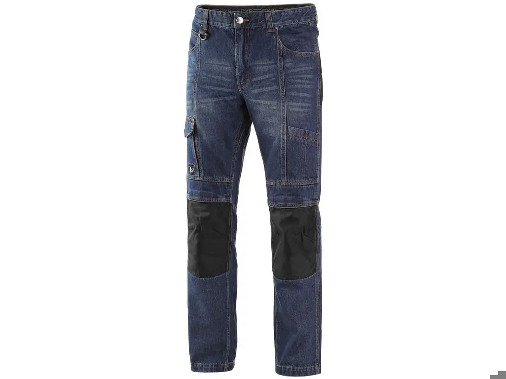 Pánské džíny, flexibilní pas s poutky na opasek a plastovým přívěskem, vnitřní protiskluzová gumová páska v pase, 2 přední kapsy, 2 zadní kapsy z materiálu CORDURA, boční multifunkční kapsy, na pravé kapse poutko pro kladivo, kolena zesílena materiálem CORDURA.
