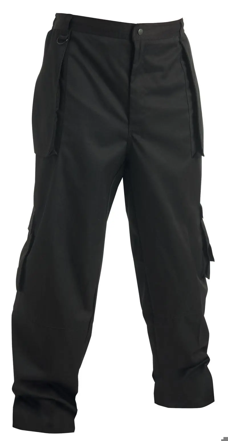 Pevné praktické kalhoty s mnoha funkčními kapsami – pocketstyle, v pase na gumu a s poutkami na pásek, multifunkční vakové přední kapsy, D kroužek z plastu, Materiál 65% polyester, 35% bavlna