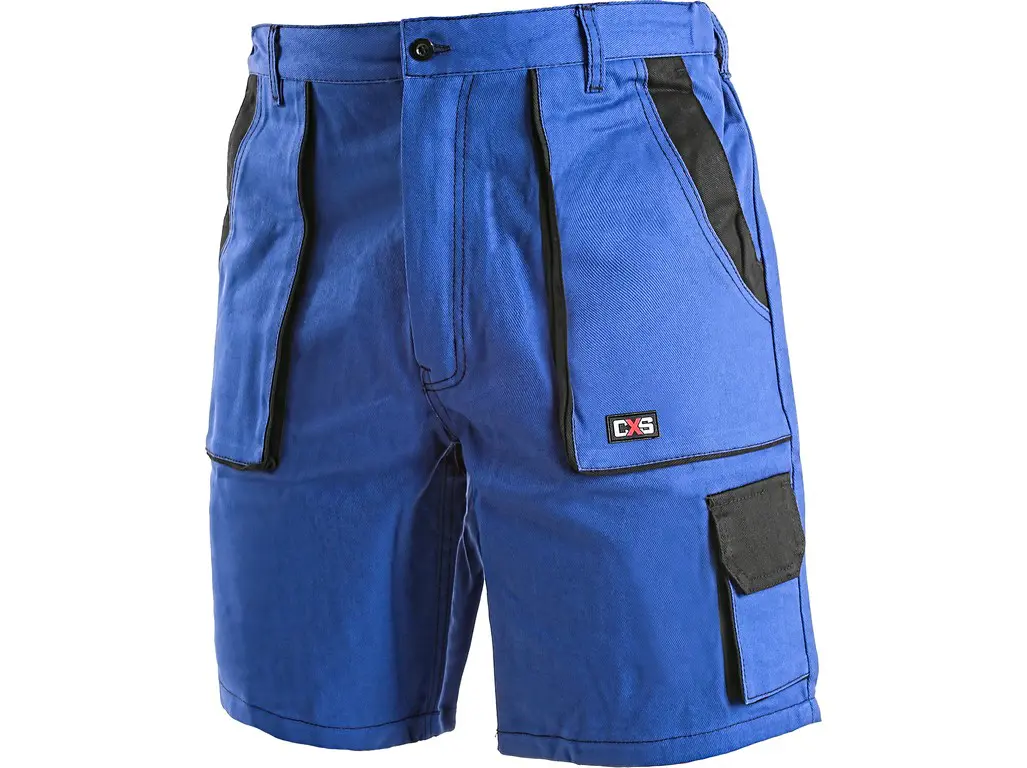 Pánské pracovní kraťasy, pevný pas vzadu do gumy s poutky na opasek, přední vakové kapsy, boční kapsy na metr a na mobil
