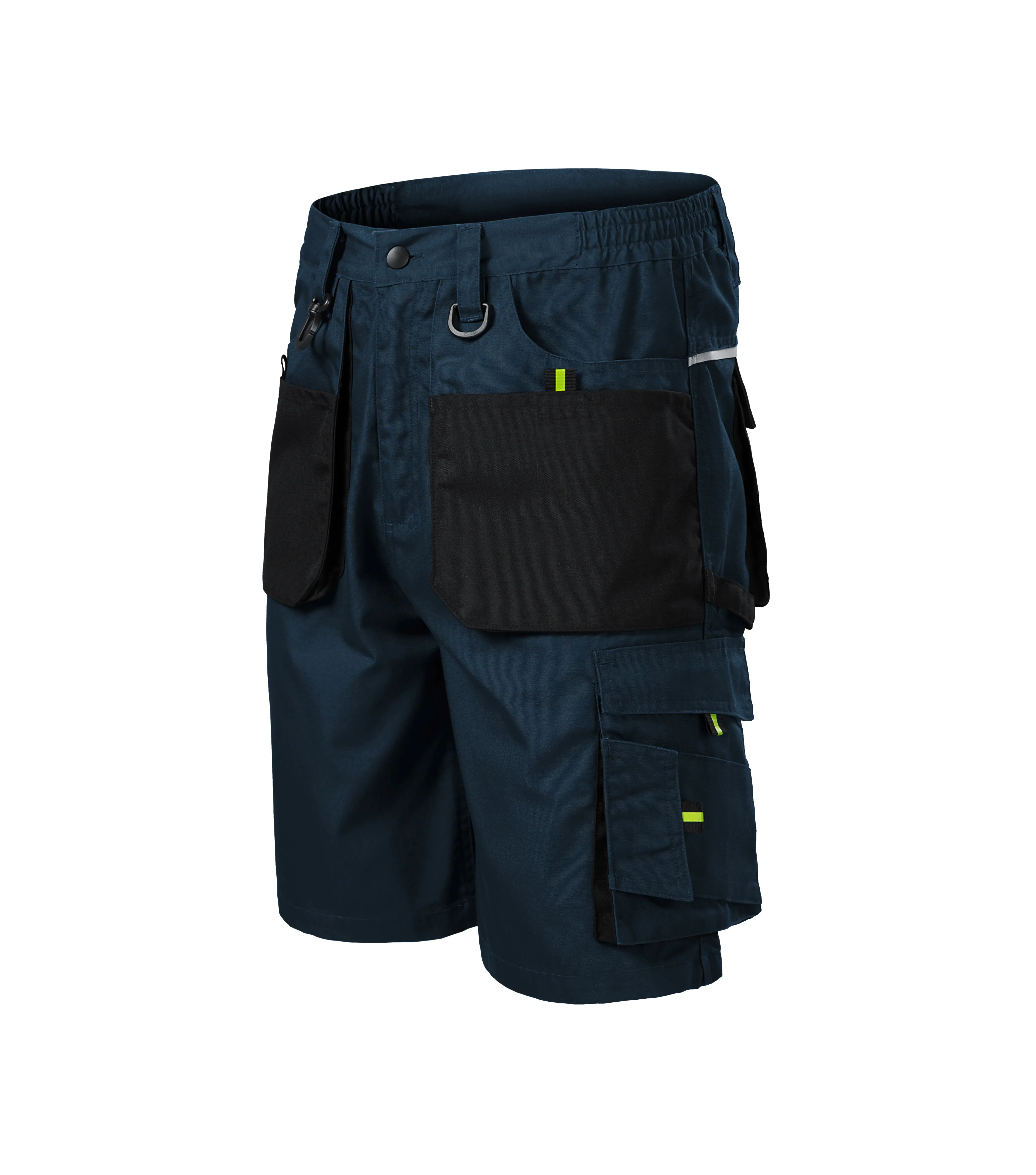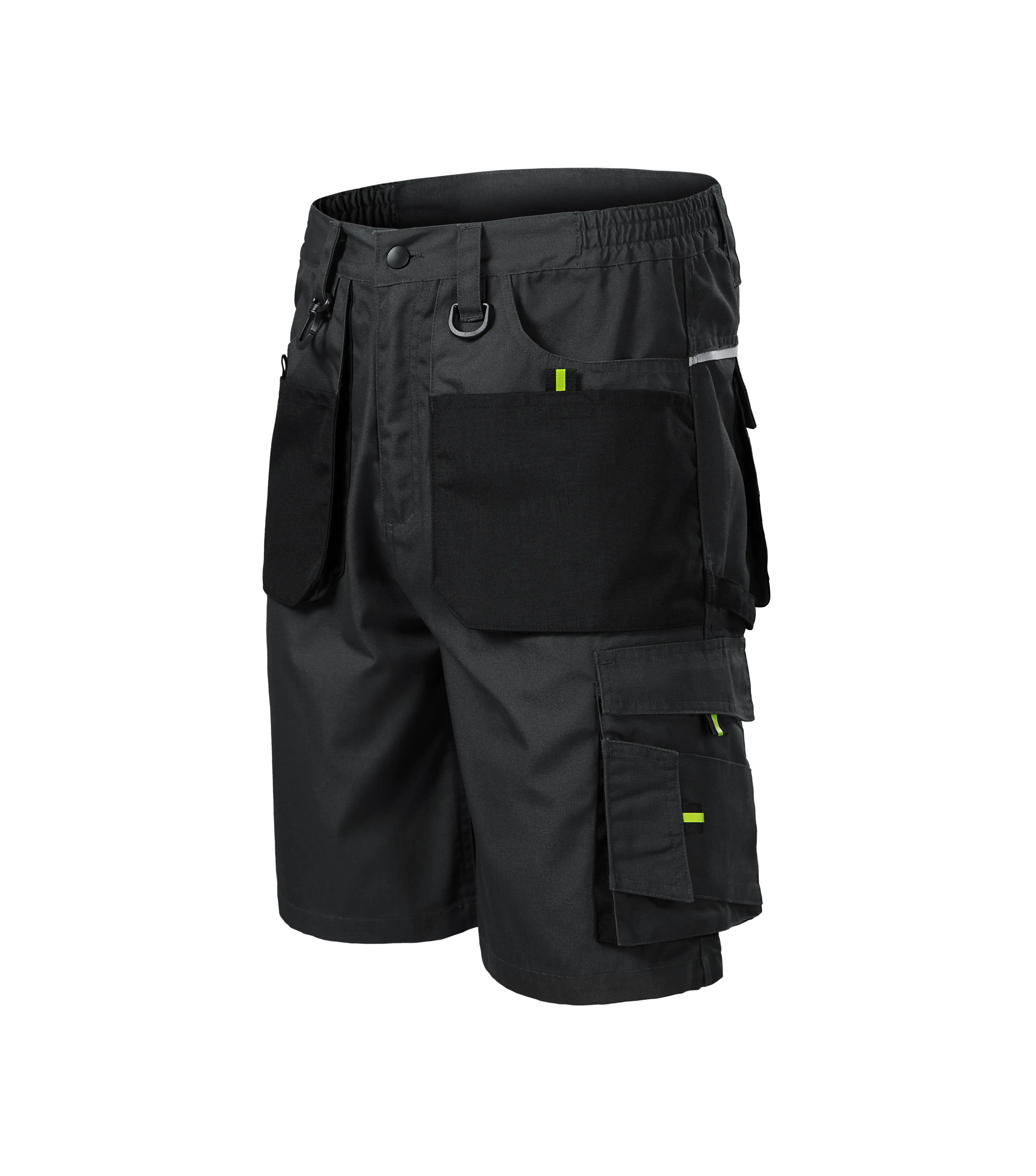 Šortky pánské, plátnová vazba, 65 % polyester, 35 % bavlna; CORDURA® 100 % polyamid, 210 g/m2, pruženka v boční části pasového límce, 10 multifunkčních kapes, plastové "D" poutko a karabina na klíče a ID karty, poutko na kladivo, dvojité prošití pro vyšší odolnost, vysoce odolný materiál CORDURA® v barvě 01, retroreflexní prvky. Velikosti 44-62.