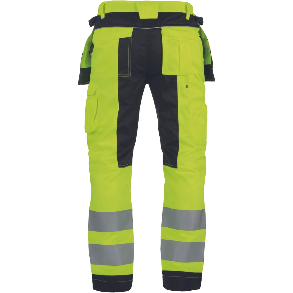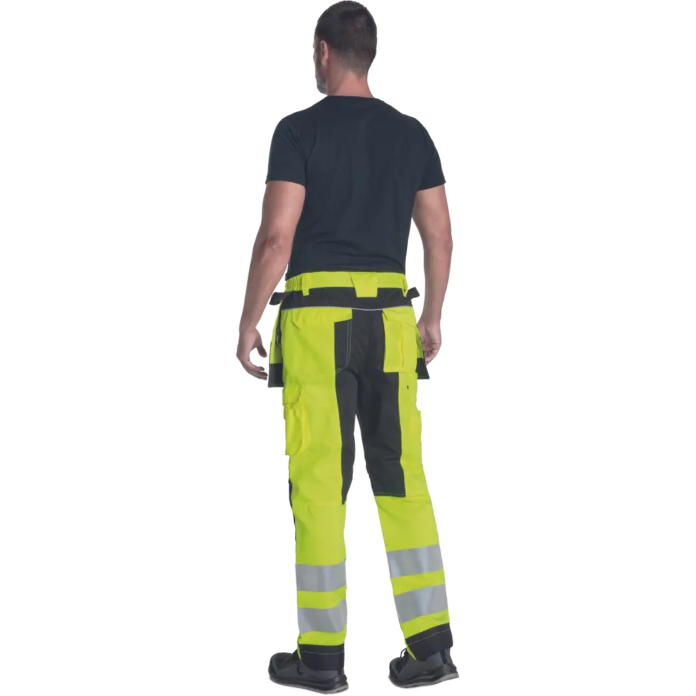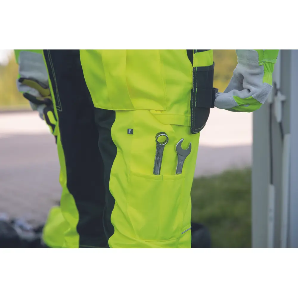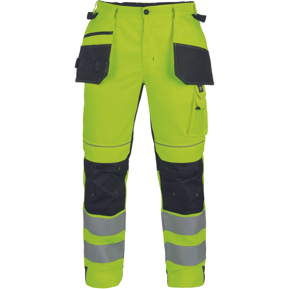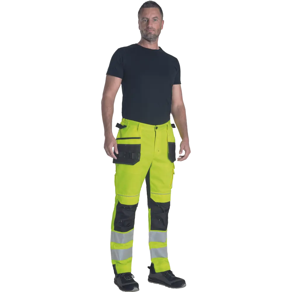 Pánské pracovní HI-VIS kalhoty s elastickým pasem, 2 multifunkční létací kapsy, 2 tištěné 7,5 cm široké reflexní pruhy na spodních nohavicích, zesílení kolenních částí Oxford 600D s možností vložení chráničů kolen, možnost prodloužení délky nohavic
