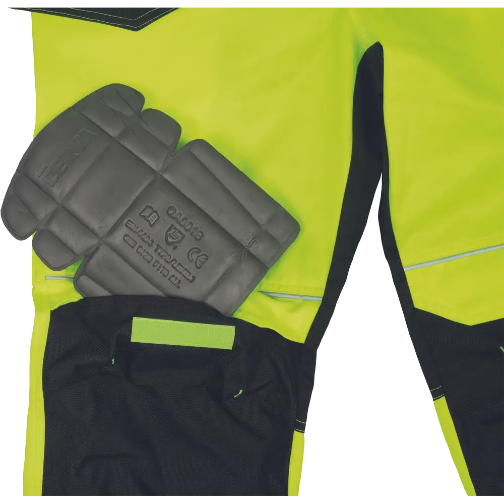 Normy: EN ISO 13688, EN ISO 20471 (Class: 2), Vlastnosti: Průmysl: Přeprava a skladování, Stavba, Strojírenství, Počet pracích cyklů: 50, Vlastnosti oděvů: Kapsy pro nákoleníky, Prodloužená délka nohavice: 5 cm, Střih: Relax, Údržba: Perte na 40 °C, běžný prací cyklus, Nebělte. Nesmí se bělit peroxidovými ani chlorovými přípravky, Nesušte v sušičce, Žehlete na nízkou teplotu, maximálně 110 °C, Chemické čištění zakázáno. Svrchní zesílená vrstva: 100 % polyester, OXFORD, Svrchní HI-VIS materiál: 65 % polyester , 35 % bavlna, 250 g/m2. Velikosti 44-68