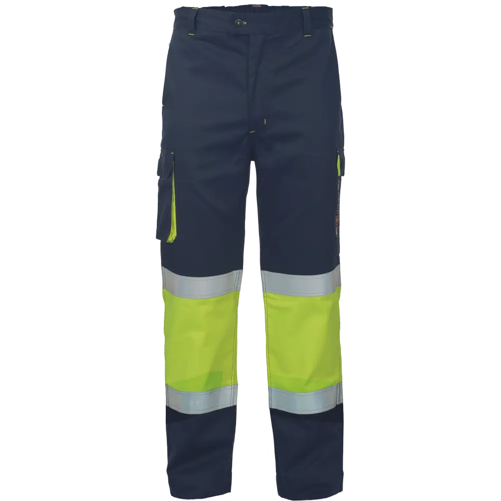 Pánské HI-VIS multinormní kalhoty s elastickým pasem; 2 boční kapsy; 2 stehenní kapsy s klopou na suchý zip; 2 zadní kapsy na suchý zip; dvojice 5 cm šitých reflexních pruhů okolo lýtek; nastavitelná délka nohavic. Svrchní materiál: 99 % nehořlavá bavlna , 1 % antistatické vlákno, 260 g/m2, tkaný kepr. EN ISO 13688 - Ochranné oděvy - Obecné požadavky, IEC 61482-2 (APC1 (4 kA)) - Práce pod napětím – Oblečení chránící před tepelným účinkem elektrického oblouku, EN ISO 20471 (Class: 1) - Oděvy s vysokou viditelností, EN ISO 11612 (A1 A2 B1 C1 F1) - Oděvy na ochranu proti teplu a plameni, EN ISO 11611 (Class1A1+A2) - Ochranné oděvy pro použití při svařování a příbuzných postupech, EN 1149-5 - Elektrostatické vlastnosti - Část 5: Materiálové a konstrukční požadavky. Vlastnosti: Průmysl: Energie a telekomunikace, Chemický průmysl, Hornictví a těžba, Těžký průmysl, Počet pracích cyklů: 50, Údržba: Perte na 60 °C, běžný prací cyklus.Nebělte. Nesmí se bělit peroxidovými ani chlorovými přípravky. Sušte v sušičce na mírný program, max. teplota sušení 60 °C. Žehlete na nízkou teplotu, maximálně 110 °C. Profesionální chemické čištění. Normální proces. Velikosti XS-XXXXL