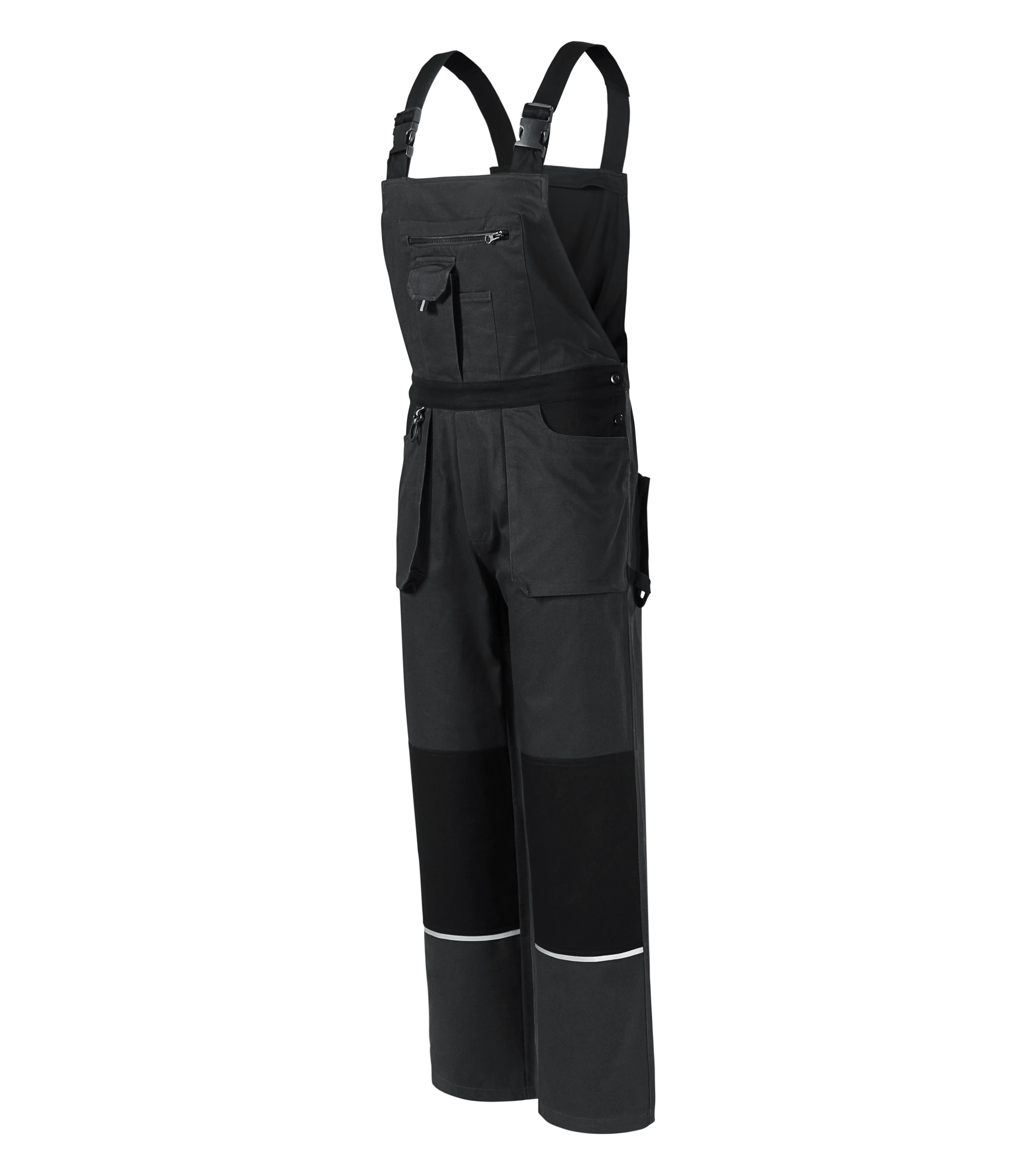 Pracovní kalhoty s laclem pánské z Kepru 100 % bavlna, pruženka v zadní části pasového límce, zapínání na knoflíky v boční části, šle s elastickým dílem nastavitelné přezkou, 8 multifunkčních kapes, zdvojený materiál v oblasti kolen a sedu, plastové "D" poutko a karabina na klíče a ID karty, poutko na kladivo, dvojité prošití pro vyšší odolnost, retroreflexní prvky. Velikosti 44/46 - 60/62
