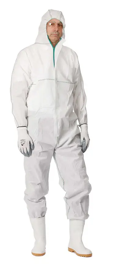 Ochranný oblek s kapucí, z netkaného polypropylenu, antistatický, ochranná klopa na zipu, rukávy a nohavice stažené gumičkou, ochrana proti průniku radioaktivních částic a některým chemikáliím, CE kat.III typ 5,6.
