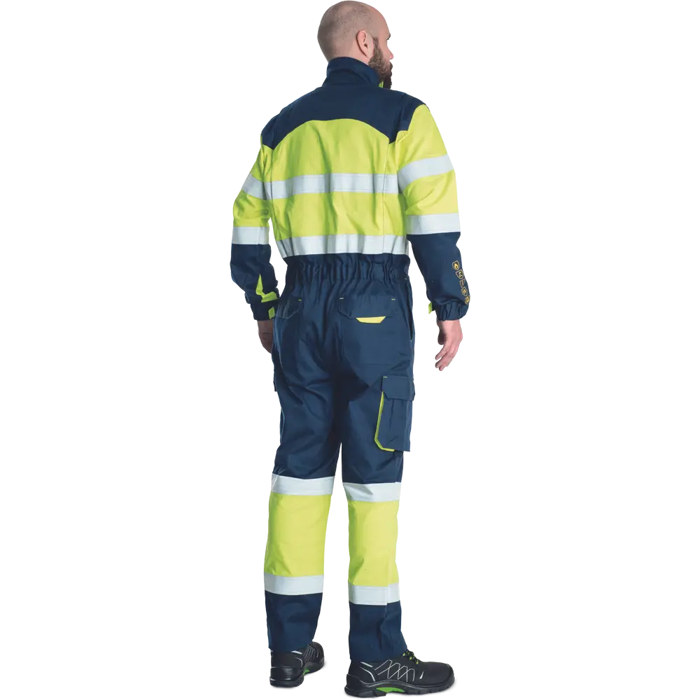Pánská HI-VIS multinormní kombinéza s elastickým pasem; zapínání na zip kryté légou na suchý zip; 2 boční kapsy; 2 stehenní kapsy s klopou na suchý zip; 2 náprsní kapsy na suchý zip; 2 zadní kapsy na suchý zip; dvojice 5 cm šitých reflexních pruhů okolo rukávů, boků a lýtek; elastické manžety rukávů se suchým zipem; nastavitelná délka nohavic.Svrchní materiál: 99 % nehořlavá bavlna , 1 % antistatické vlákno, 260 g/m2, tkaný kepr. EN ISO 13688 - Ochranné oděvy - Obecné požadavky, IEC 61482-2 (APC1 (4 kA)) - Práce pod napětím – Oblečení chránící před tepelným účinkem elektrického oblouku, EN ISO 20471 (Class: 1) - Oděvy s vysokou viditelností, EN ISO 11612 (A1 A2 B1 C1 F1) - Oděvy na ochranu proti teplu a plameni, EN ISO 11611 (Class1A1+A2) - Ochranné oděvy pro použití při svařování a příbuzných postupech, EN 1149-5 - Elektrostatické vlastnosti - Část 5: Materiálové a konstrukční požadavky. Vlastnosti: Průmysl: Energie a telekomunikace, Chemický průmysl, Hornictví a těžba, Těžký průmysl, Počet pracích cyklů: 50, Údržba: Perte na 60 °C, běžný prací cyklus.Nebělte. Nesmí se bělit peroxidovými ani chlorovými přípravky. Sušte v sušičce na mírný program, max. teplota sušení 60 °C. Žehlete na nízkou teplotu, maximálně 110 °C. Profesionální chemické čištění. Normální proces. Velikosti XS-XXXXL