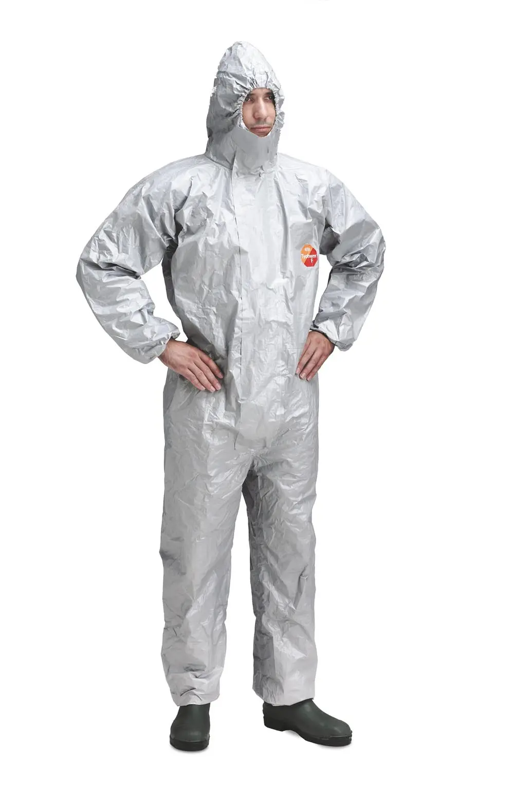 Ochranný oblek Tychem® F (DuPont) s kapucí a přelepenými švy, netkaný polyetylén Tyvek® s polymerní barierovou a krycí vrstvou, antistatický, bez silikonů, ochrana proti vodě, koncentrovaným anorganickým a organickým chemikáliím, ultrajemným částicím, CE kat.III typ 3,4, barva stříbřitě šedá.
