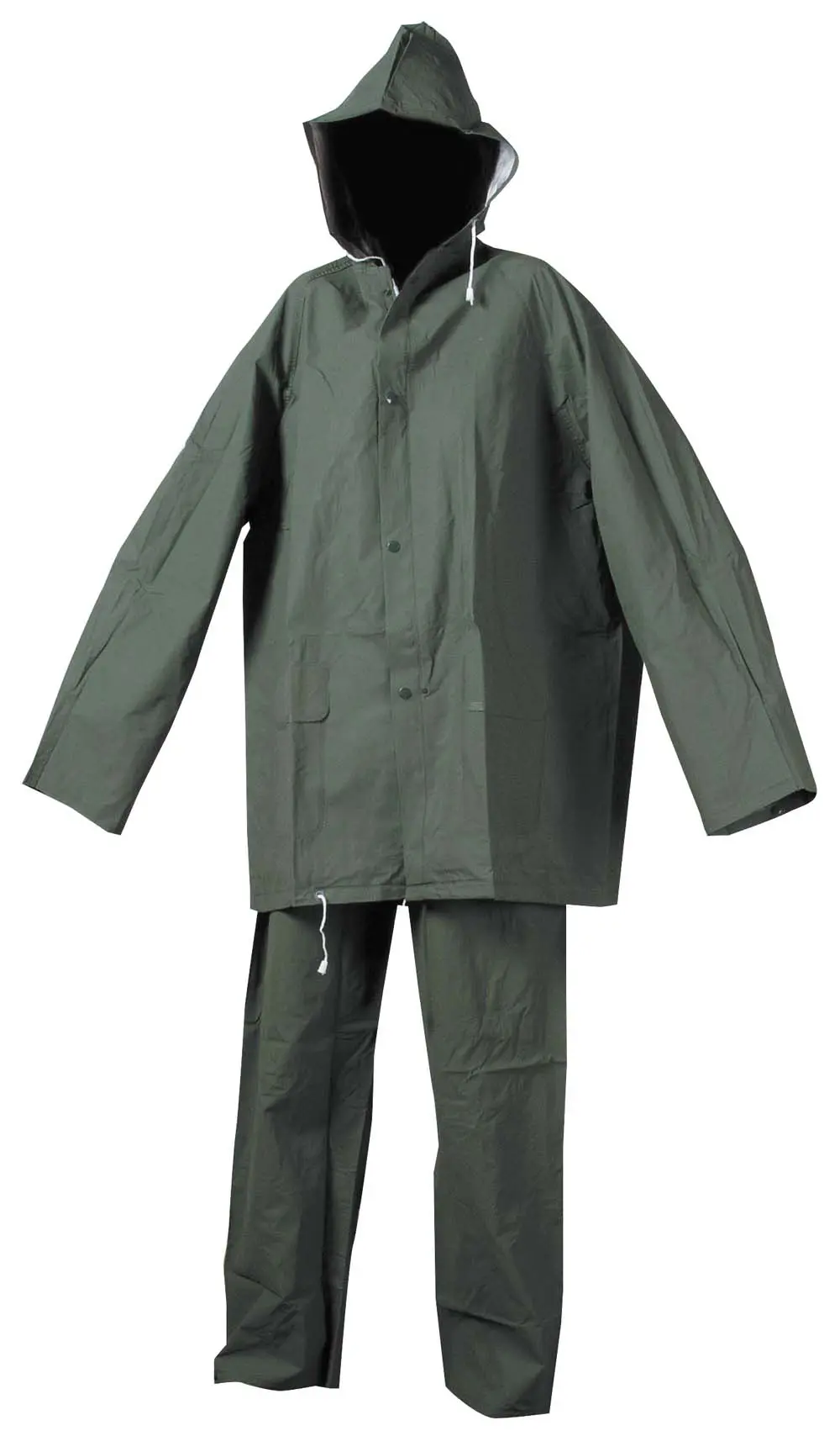 Voděodolný dvoudílný oblek – 3 plášť s kapucí a kalhoty v pase na gumu, všechny spojovací švy jsou zatavené, materiál s nánosem PVC, dvě přední kapsy kryté légami proti průniku vody, spodní část rukávů lze regulovat drukem, ventilace na zádech a v podpaží