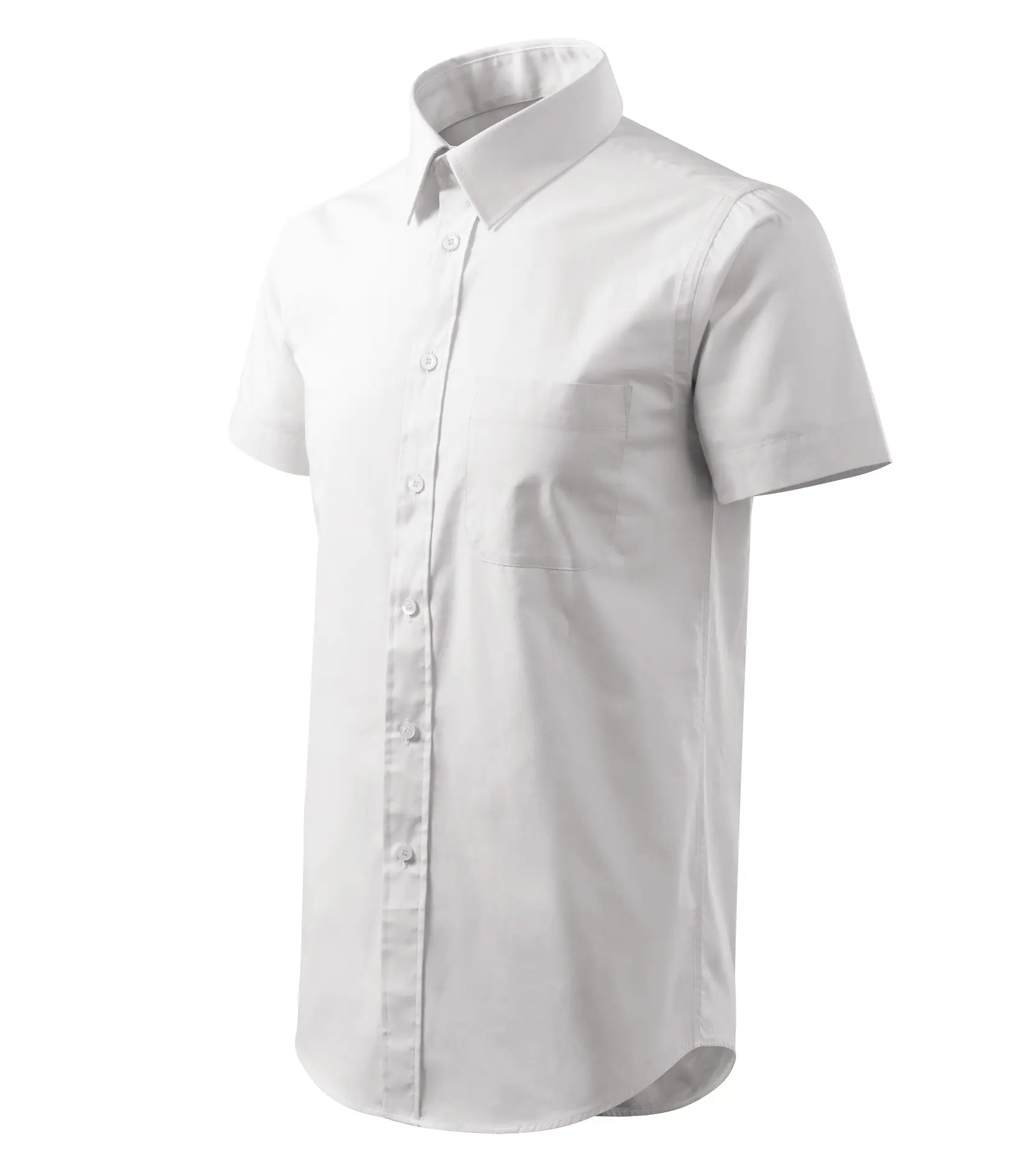 Pánská košile s krátkým rukávem z jemného materiálu. Zadní díl tvarovaný dvojitým sedlem a složenými záhyby pro větší volnost. Nakládaná kapsa na levém předním díle. Přední kraj začištěný légou, zapínání na knoflíčky. Dvoudílný košilový límec. Tvarovaný dolní kraj.