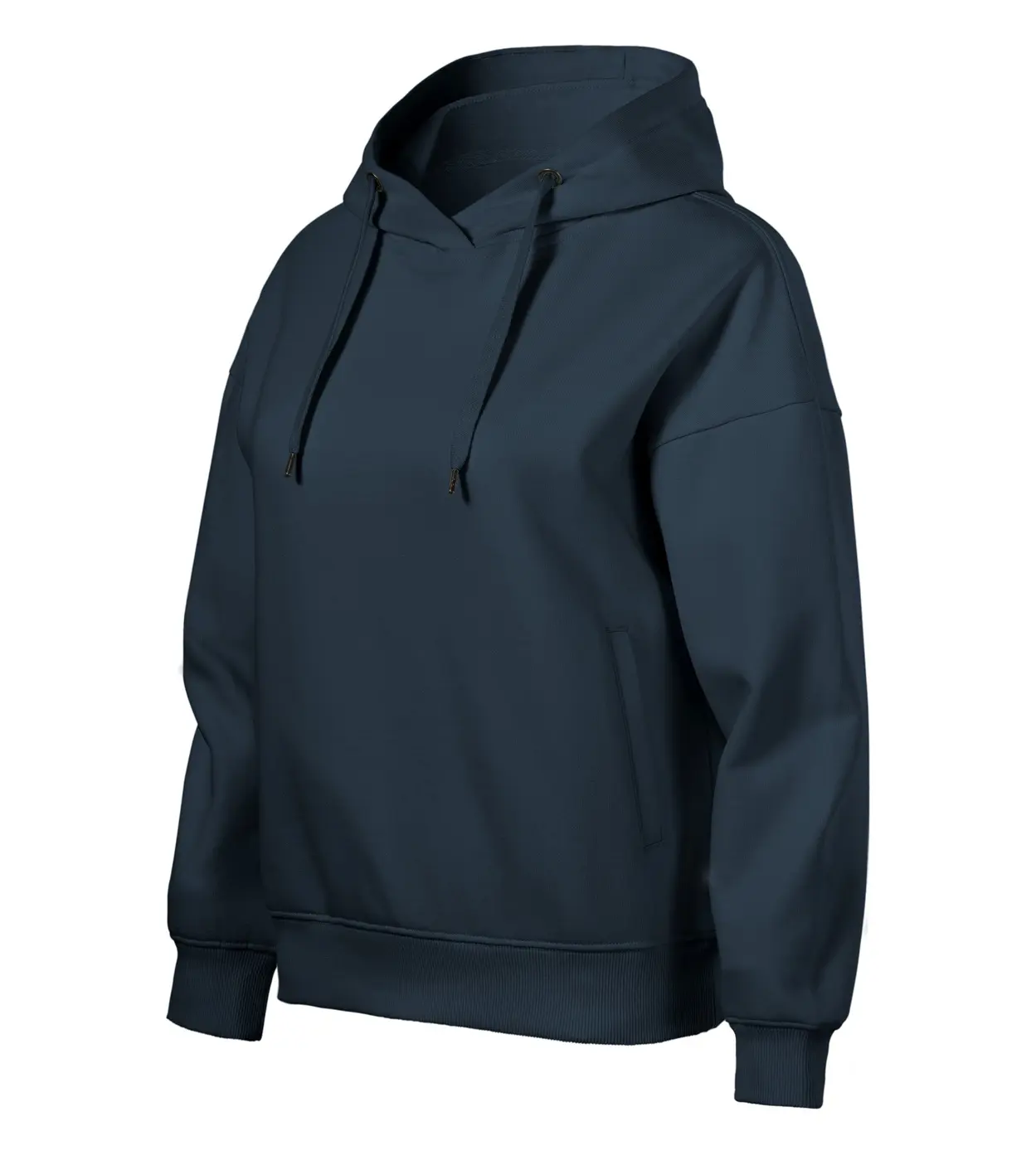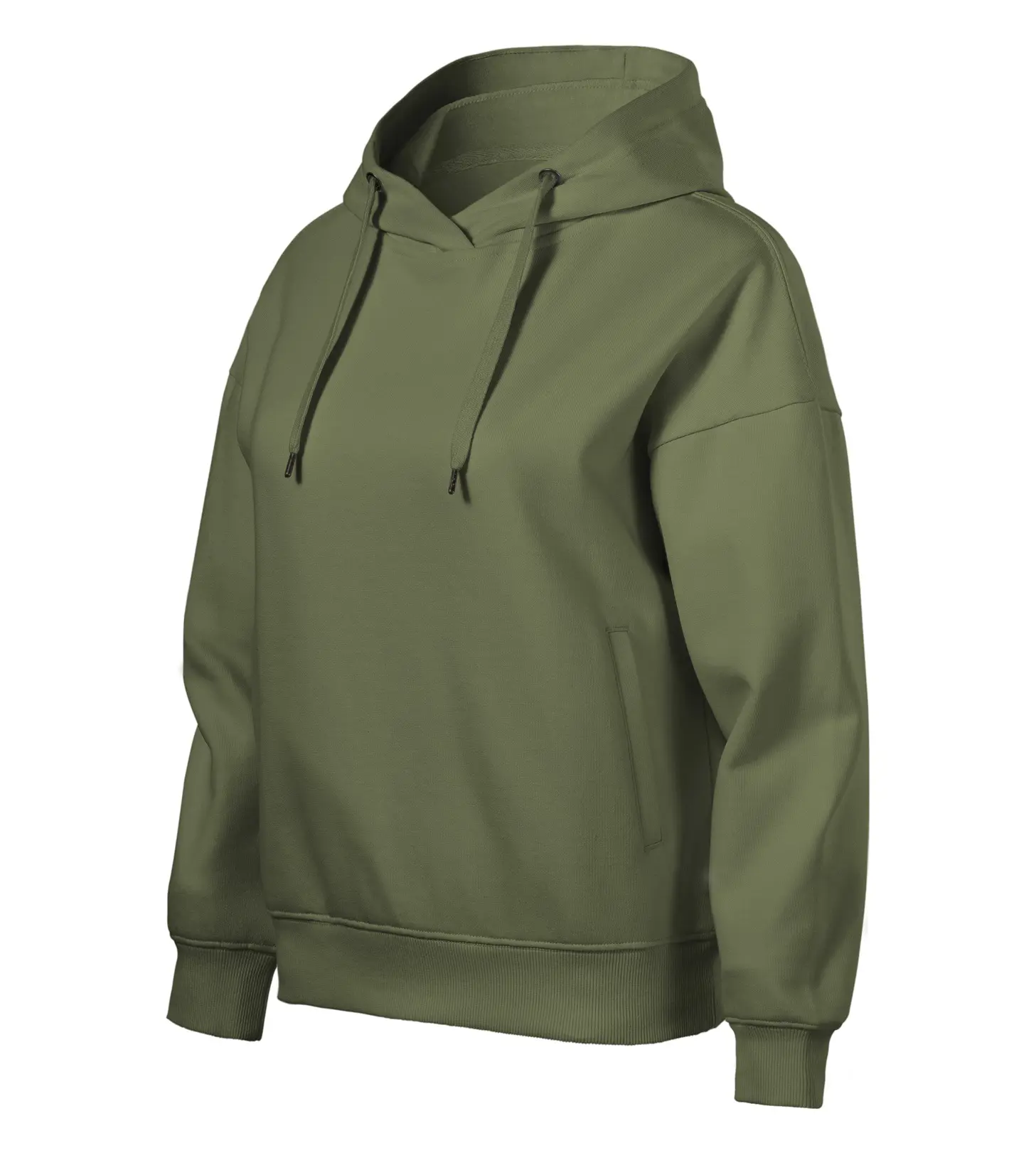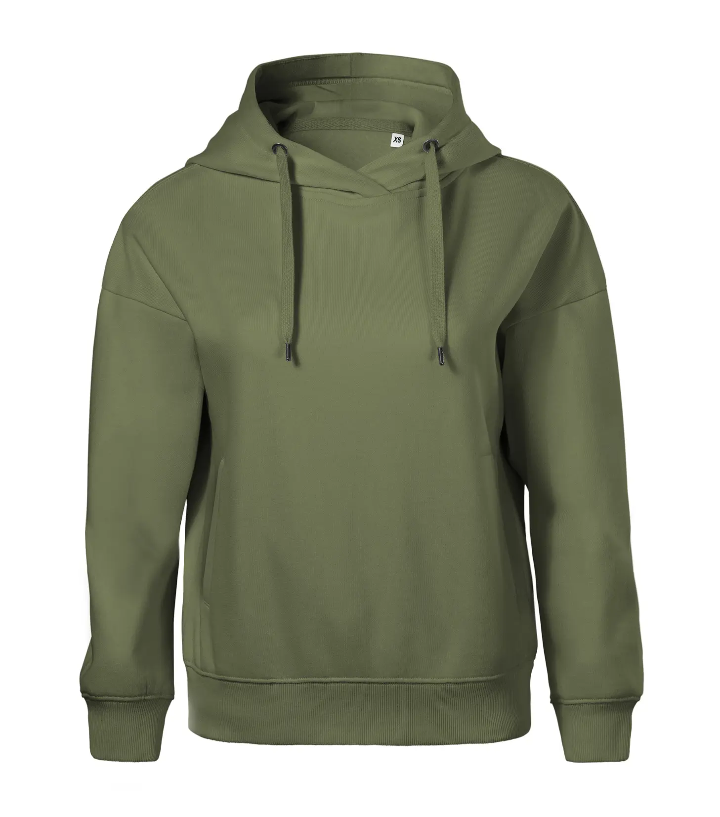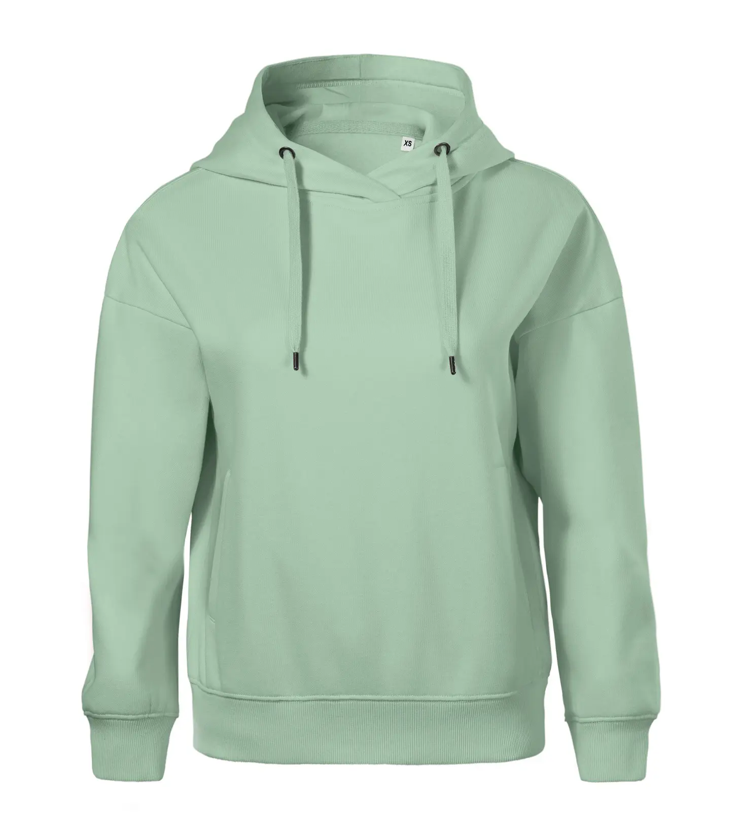 Mikina dámská s kapucí MOON, Výplňková pletenina, vnitřní strana počesaná, 80 % bavlna, 20 % polyester (barva 12 - složení se může lišit - 75 % bavlna, 25 % viskóza), volný střih s bočními švy, kapuce s podšívkou, na stažení šňůrkou, neutrální velikostní štítek v boční části průkrčníku, vnitřní část průkrčníku začištěna páskou v barvě vrchového materiálu, nízkohlavicové rukávy, lištové kapsy ve stylu klokanky, dolní lem a manžety rukávů z žebrového úpletu 2:2 s 5 % elastanu, vnitřní strana počesaná, Zhodnocení: výšivka, sítotisk, transfer digitální, litho transfer, transfer sítotiskový. Velikosti XS - XXL