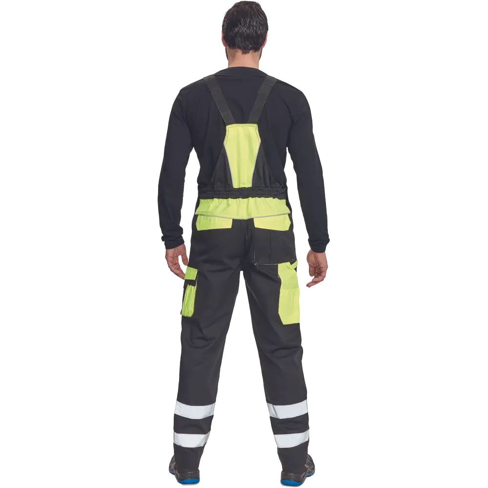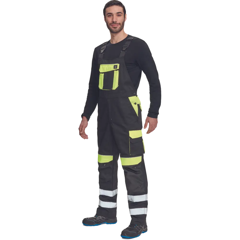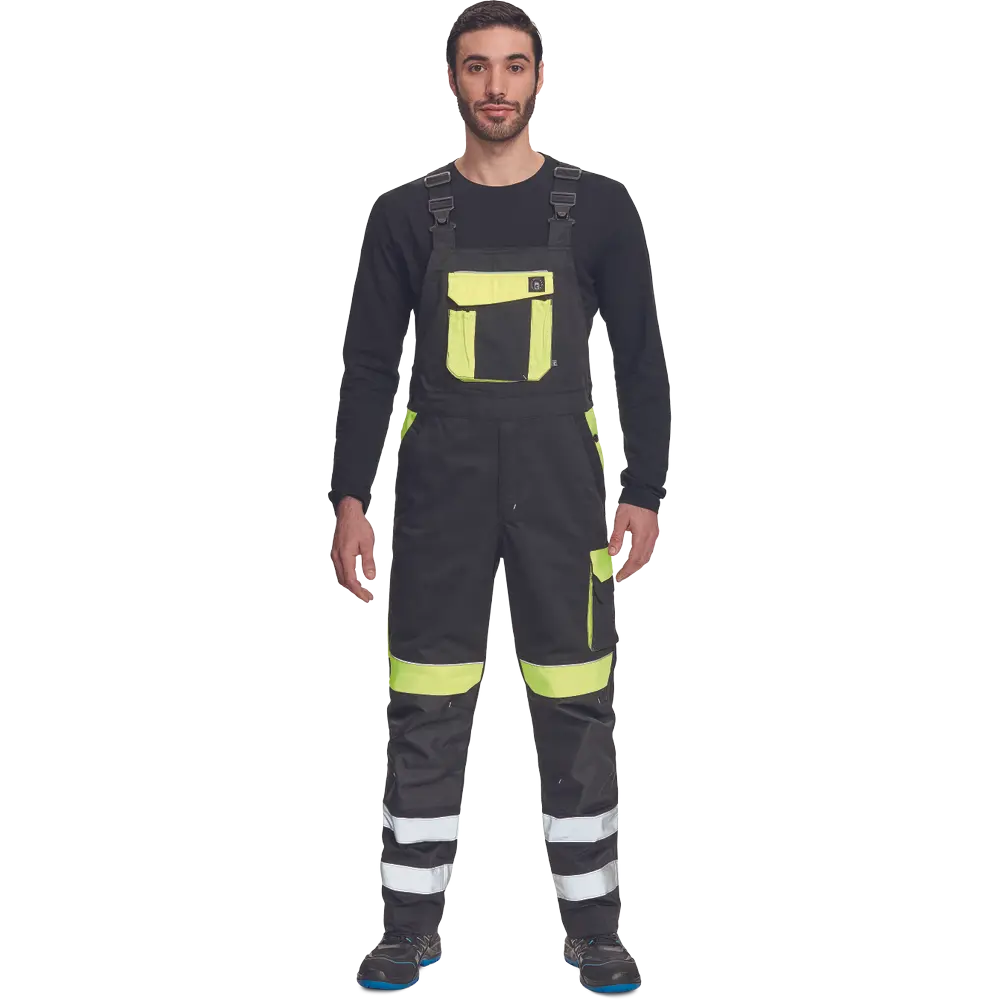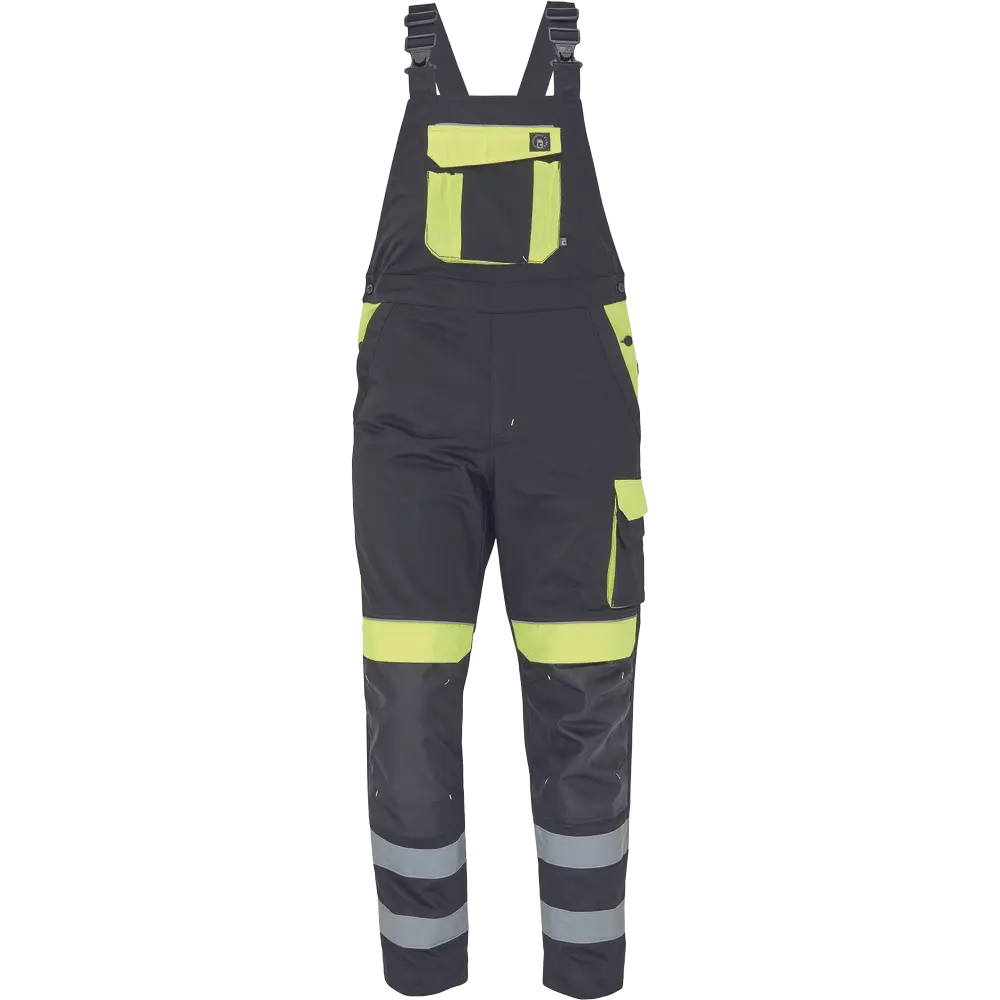 Pánské reflexní pracovní kalhoty s laclem a elastickým pasem, široké šle s plastovými sponami, 2 přední kapsy, 1 levá zdvojená stehenní kapsa, 1 velká náprsní kapsa na suchý zip, 2 zadní kapsy, 2 menší zadní kapsičky na pravém stehnu, dvojice našitých 5 cm reflexních pruhů na spodní části nohavic, reflexní paspulky, Oxford 600D zesílení kolen s možností horního vkládání nákoleníků, možnost prodloužení nohavic. Normy: EN ISO 13688, Vlastnosti: Vlastnosti oděvů: Kapsy pro nákoleníky