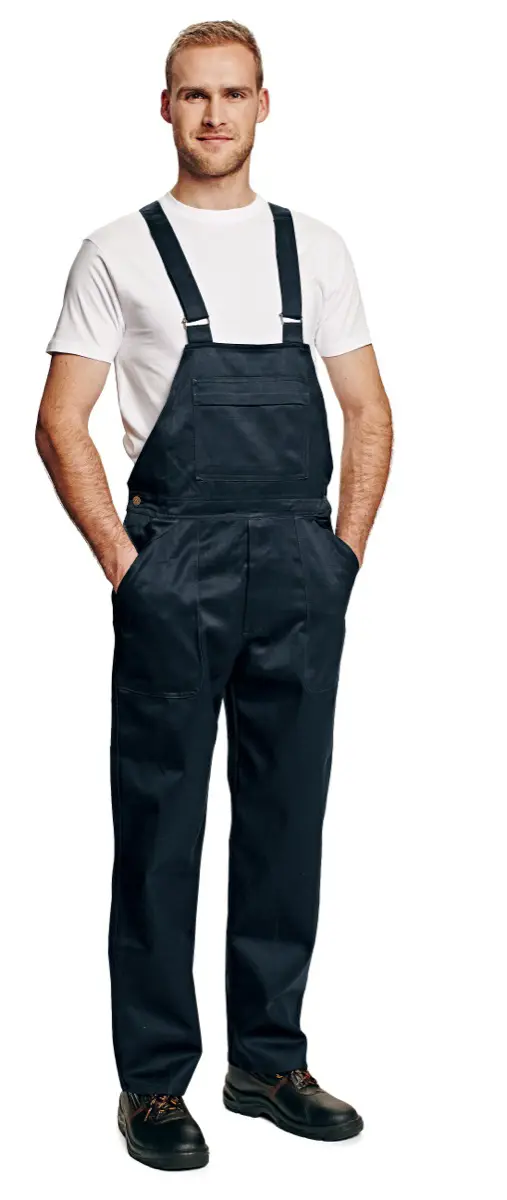 Antistatické kalhoty s laclem s nehořlavou úpravou na bázi probanu, 100% bavlna, 360 g/m2, mnoho kapes, zesílená kolena a sed