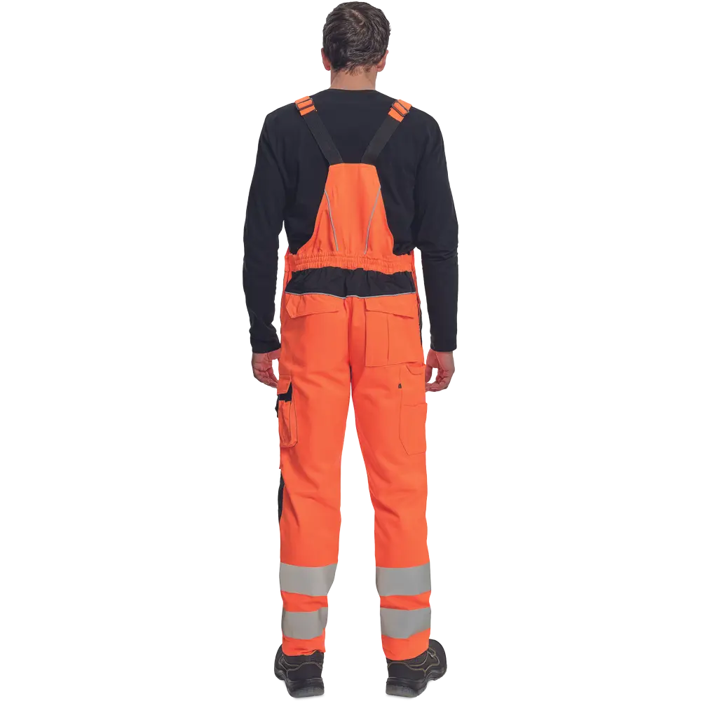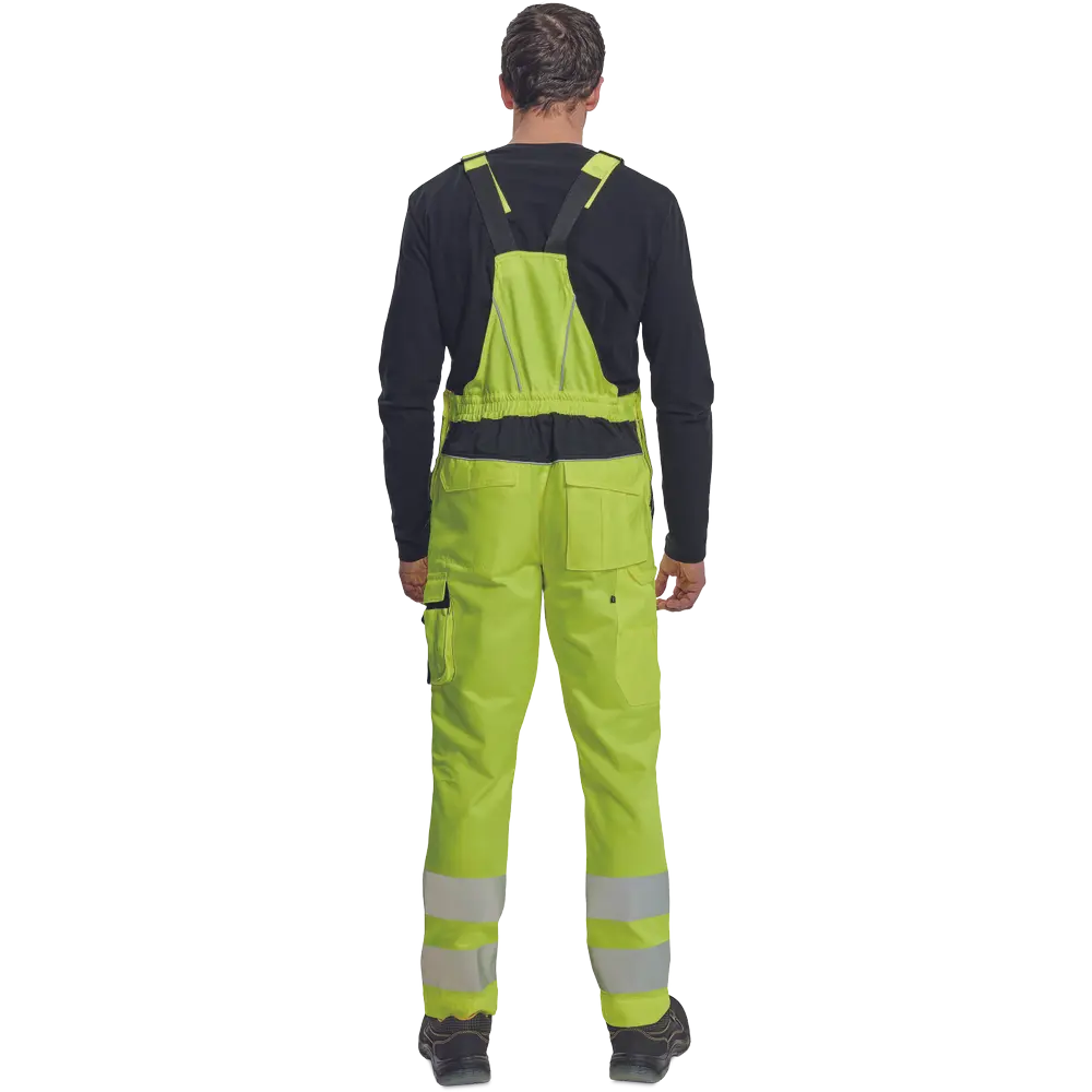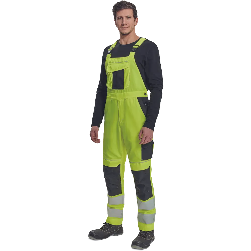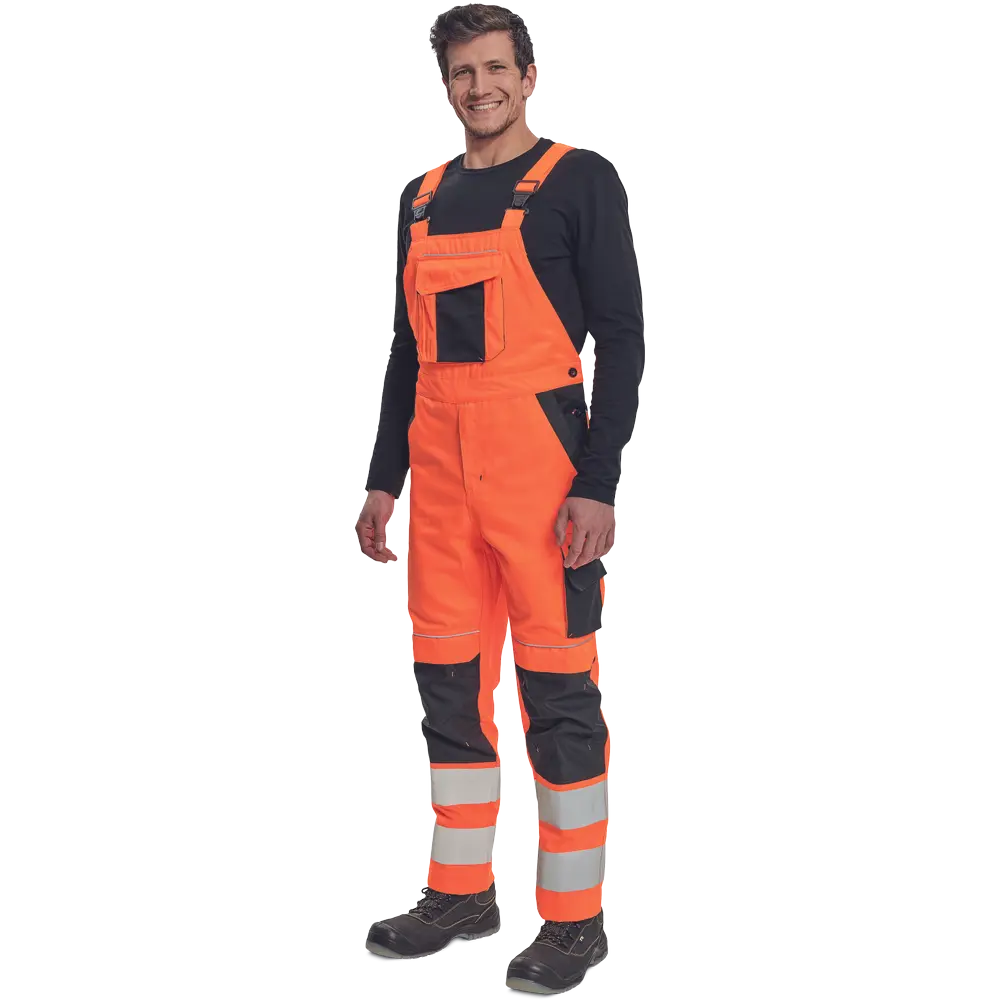 Pánské HI-VIS pracovní kalhoty s laclem a elastickým pasem; široké šle s plastovými sponami; 2 přední kapsy, 1 levá zdvojená stehenní kapsa; 1 velká náprsní kapsa na suchý zip, 2 zadní kapsy, 2 menší zadní kapsičky na pravém stehnu; dvojice tištěných 7.5 cm reflexních pruhů na spodní části nohavic, reflexní paspulky; Oxford 600D zesílení kolen s možností horního vkládání nákoleníků; možnost prodloužení nohavic. Svrchní materiál: 65 % polyester , 35 % bavlna, 250 g/m2, Svrchní zesílená vrstva: 100 % polyester, OXFORD. Normy EN ISO 13688, EN ISO 20471 (Class: 2), Vlastnosti oděvů: Kapsy pro nákoleníky, Prodloužená délka nohavice: 5 cm, Střih: Relax, Počet pracích cyklů: 50, Perte na 40 °C, běžný prací cyklus, Nebělte. Nesmí se bělit peroxidovými ani chlorovými přípravky, Nesušte v sušičce, Žehlete na nízkou teplotu, maximálně 110 °C, Chemické čištění zakázáno. Velikosti: 44-68