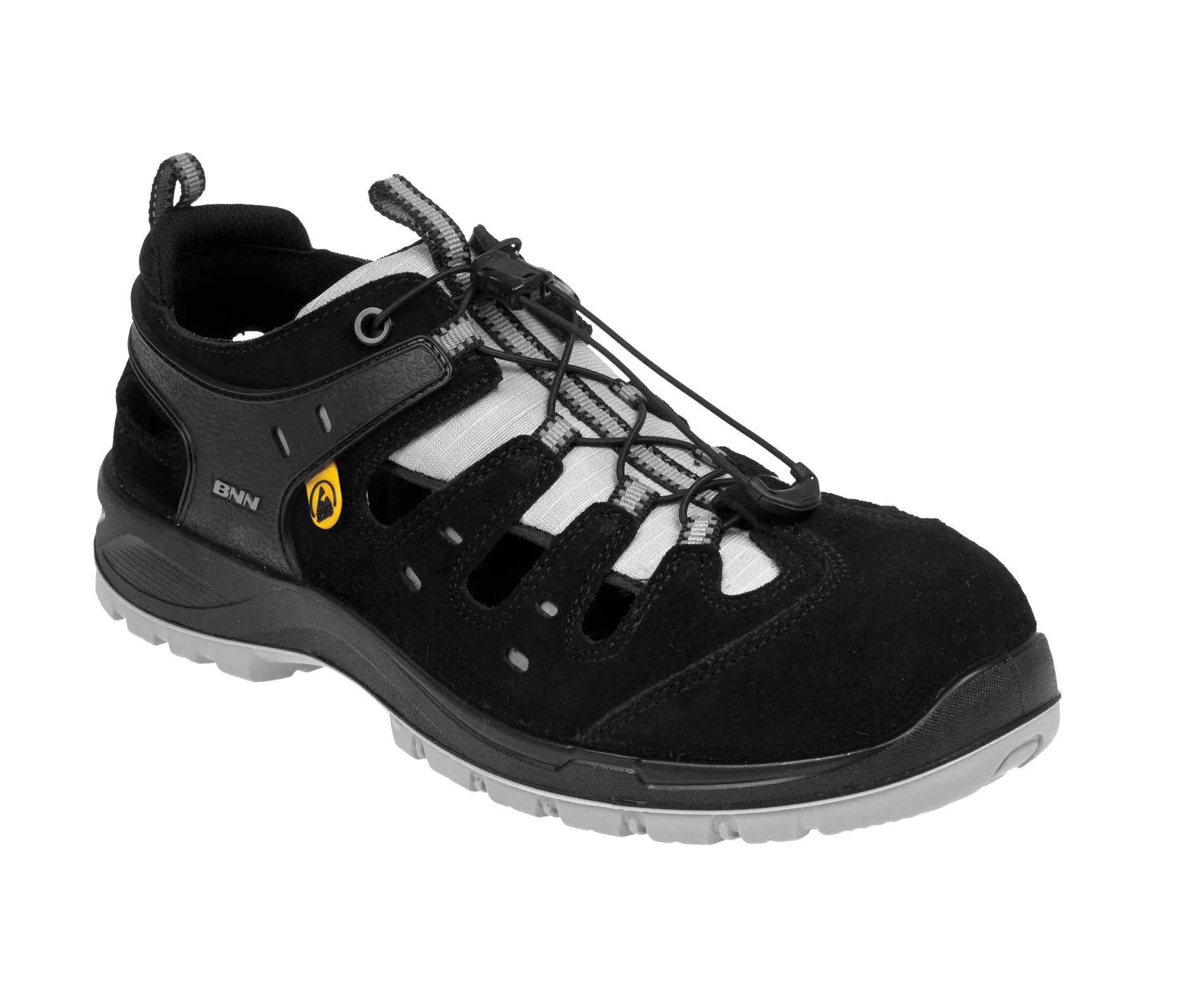 Vzdušný bezpečnostní sandál bez kovových součástí BENNON BOMBIS LITE S1P ESD NM GREY SANDAL Z51016v62, NON METALLIC, s plastovou tužinkou a kevlarovou planžetou. Svršek sandálu je z broušené hovězinové štípenky a textilu, podšívka je ze syntetického materiálu a mikrovlákna v patní části, stélka D-SOLE Black je anatomicky tvarovaná. Nástřiková podešev HIGHWAY PU/PU. Pásek na jazyku a patní očko jsou opatřeny reflexním prvkem. Šněrování bot je elastické, zakončeno plastovou koncovkou. Obuv je vhodná do vnitřních i venkovních suchých provozů. EN ISO 20345:2011 S1P SRC, ČSN EN 61340-4-3:2002, klimatická třída 3. Materiál: hovězinová štípenka + textílie, Vlastnosti produktu: bezpečnostní sandál NON METALLIC S1P