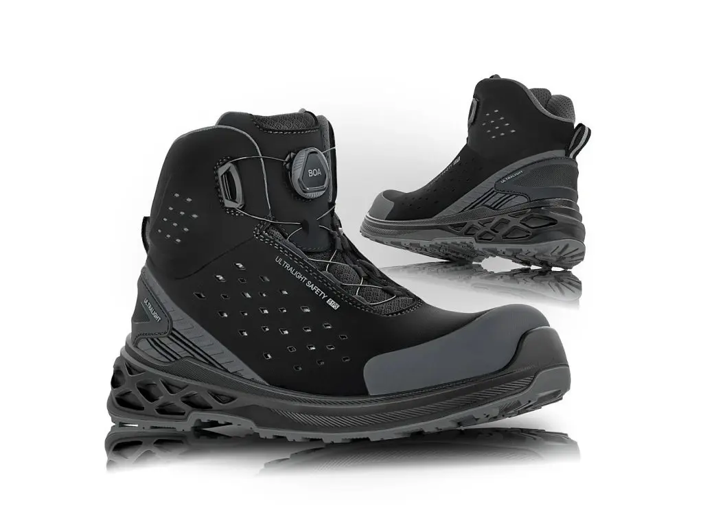 absorbce energie v patě, antistatická, BOA obuv s uzavíracím systémem Boa Fit Systém, ESD, nekovová stélka proti propichu, nekovová tužinka ve špičce, obuv bez kovových součástí, podrážka odolná olejům, prodyšný materiál, protiskluzová podrážka