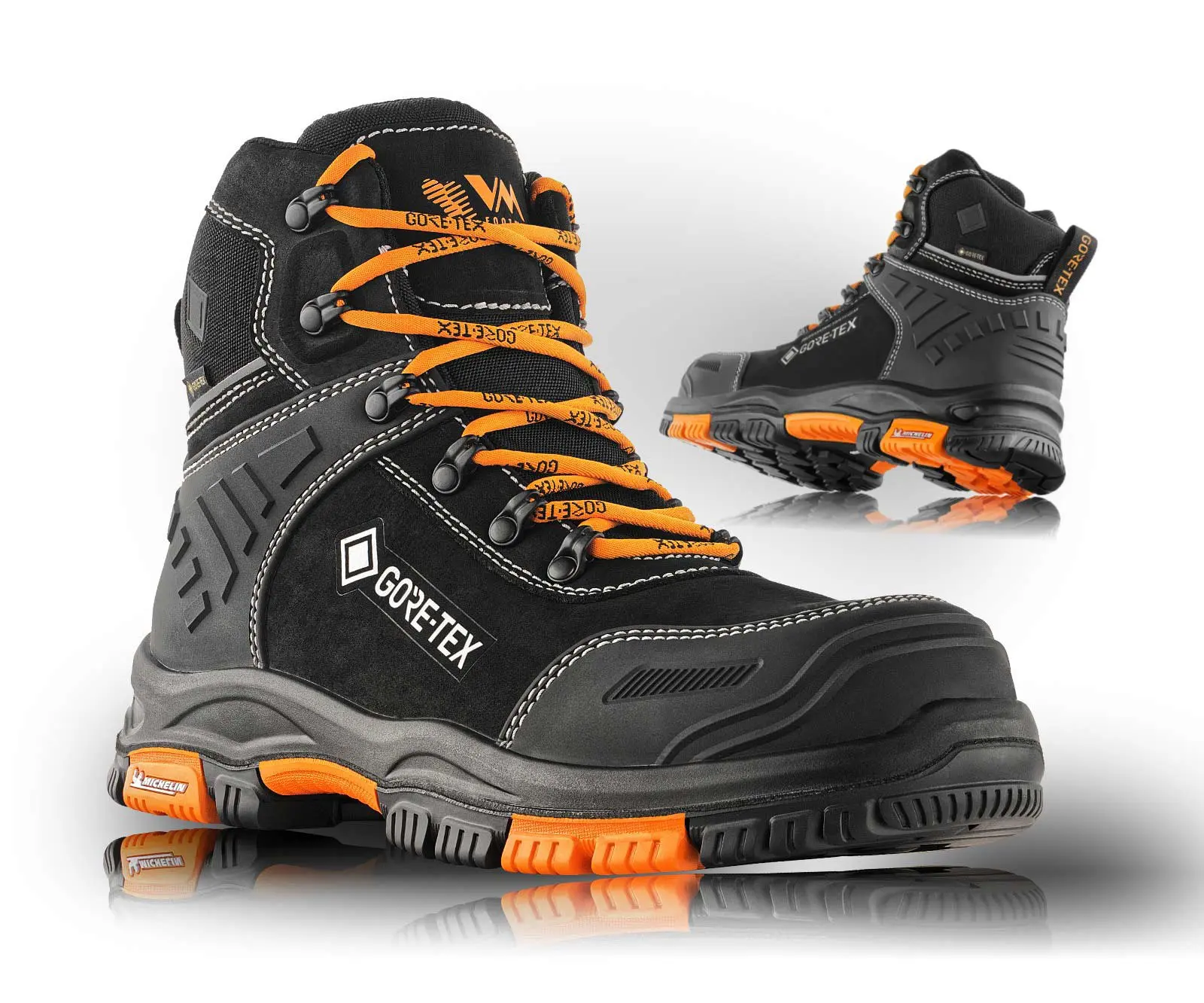 absorbce energie v patě, GORE-TEX®, Podešev MICHELIN, podrážka odolná olejům, podrážka odolná teplu, prodyšný materiál, prodyšný svršek, protiskluzová podrážka, svršek odolný vodě