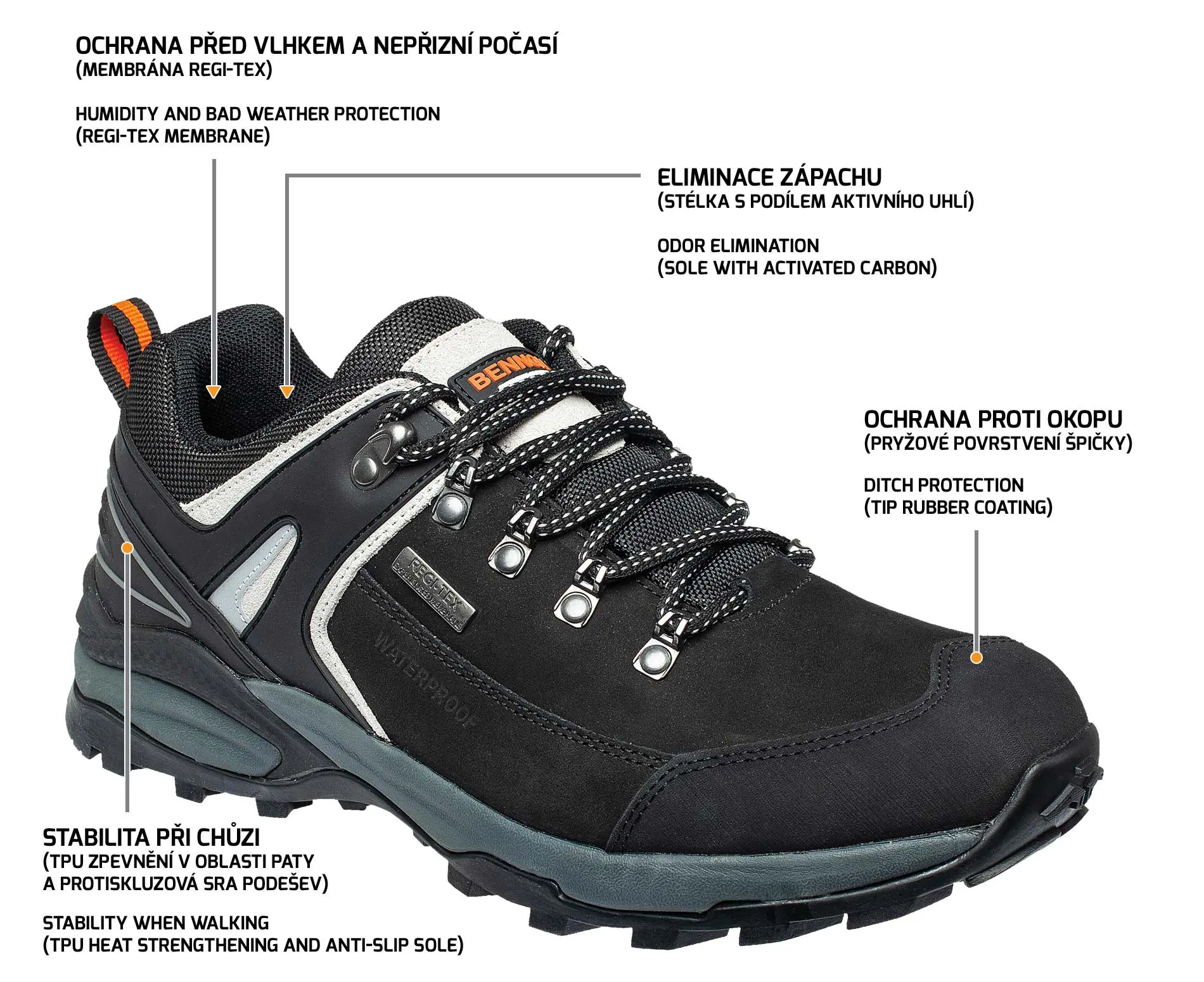 Nízká pohodlná polobotka, která je určena na běžné nošení i outdoorové aktivity. Obuv je vybavená voděodolnou membránou REGI-TEX®, která chrání chodidla před vlhkem a nepřízní počasí. Díky ochrannému TPU dílu v patní části je chodidlu poskytnuta maximální jistota v nášlapu, pryžové povrstvení špičky zvyšuje odolnost obuvi v terénu (ochrana proti okopu). Další výhodou je odpružení v oblasti paty, které tlumí nárazy způsobené chůzí, čímž šetří klouby a svalstvo nohou. Stélka ABSORBA XTR díky podílu aktivního uhlí, který eliminuje zápach, zajišťuje, že vaše chodidla vydrží déle svěží.Podešev RAMMER má protiskluzové SRA vlastnosti, čímž v náročném terénu přispívá k lepší stabilitě při chůzi.Za tmy a šera zajisté oceníte po bocích umístěné výrazné reflexními prvky, neboť díky nim budete po osvitu dobře viděni. Obuv je certifikována dle normy EN ISO 20347:2012 (O2 SRA WR). MATERIÁLOVÝ POPIS vrchový materiál: Nubuck hovězinová useň hydrofobní podšívka: membrána REGI-TEX® stélka: ABSORBA XTR, podešev: RAMMER EVA/pryž. Velikosti 36-48