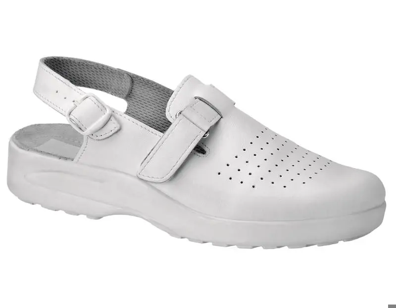 Kožený sandál s plnou špicí, perforovaný s přezkou na suchý zip a páskem kolem paty.