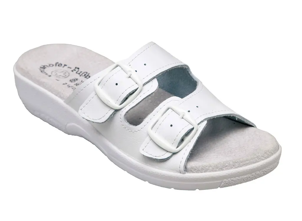 Dámské profi pantofle, vhodné do zdravotnických provozů, domovů a pečovatelských domů i škol, dvoupásková se sponami, obuv je vyrobena z přírodních materiálů (useň, textil), jsou měkké, prodyšné a absorbují vlhkost, jejich důležitou vlastností je rovněž to, že se přizpůsobí anatomickému tvaru chodidla.