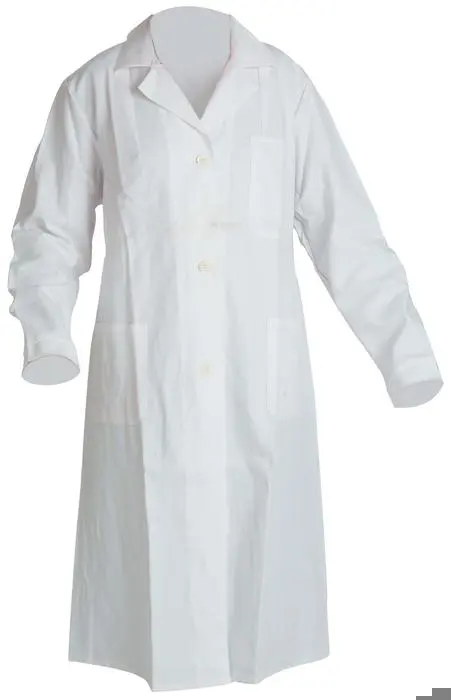 Dámský bílý bavlněný plášť s dlouhým rukávem a límečkem, projmutý dámský střih, dvě boční kapsy, jedna náprsní kapsička, zapínání na knoflíky, vzadu volný pásek. Materiál: 100% vyvařovací bavlna 240g/m2. Velikosti: 40, 42, 44, 46, 48, 50, 52, 54, 56, 58, 60