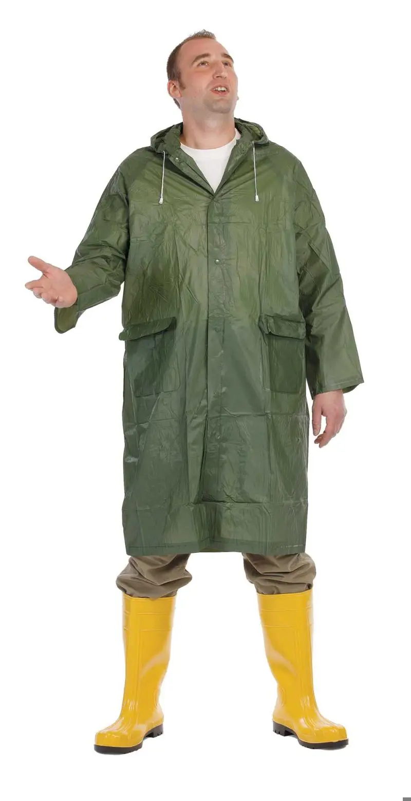 Voděodolný ochranný plášť s kapucí, odlehčený materiál z měkčeného PVC bez textilní mřížky, prodloužená délka zhruba pod kolena, všechny spojovací švy jsou zatavené, dvě přední kapsy kryté légami proti průniku vody, spodní část rukávů lze regulovat drukem, ventilace na zádech a v podpaží