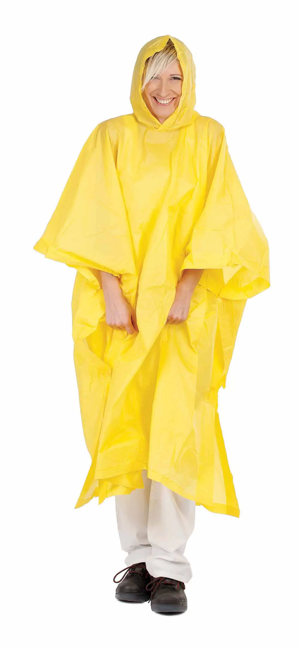 Pončo s kapucí a bočním zapínáním na druky, prodloužený střih pod kolena, pevný lehký měkčený PVC materiál, volný střih k okamžitému použití přes klasický pracovní oděv, všechny spojovací švy jsou zataveny, transportní obal
