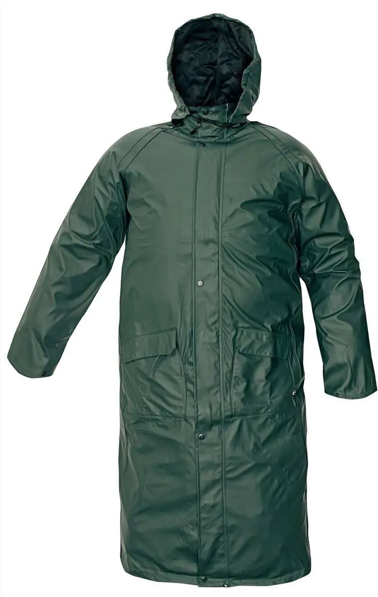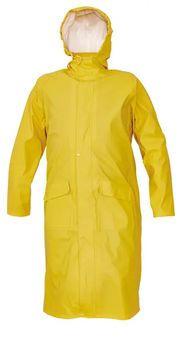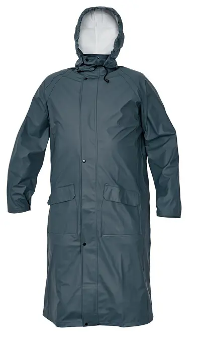 Nepromokavý a větruodolný prodloužený plášť s kapucí v límci, délka 120 cm, obvod kapuce lze stáhnout na tkaničku, dvě přední kapsy kryté légami s reflexní paspulí pro zvýšení viditelnosti, spodní lem rukávů lze polohovat drukem