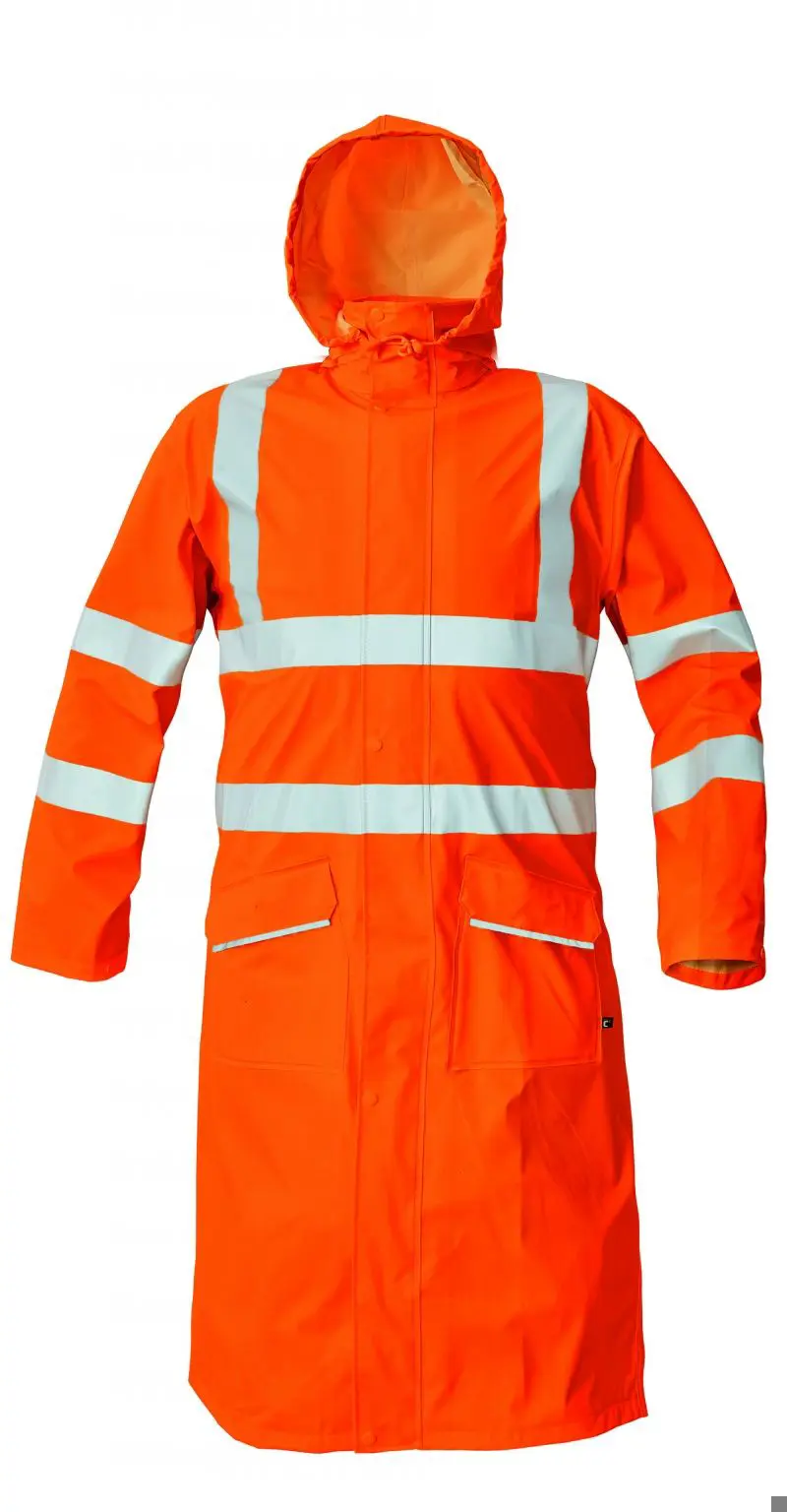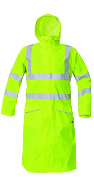 Nepromokavý a větruodolný prodloužený plášť s kapucí v límci s reflexními pruhy, délka 120 cm, obvod kapuce lze stáhnout na tkaničku, dvě přední kapsy kryté légami s reflexní paspulí pro zvýšení viditelnosti, spodní lem rukávů lze polohovat drukem