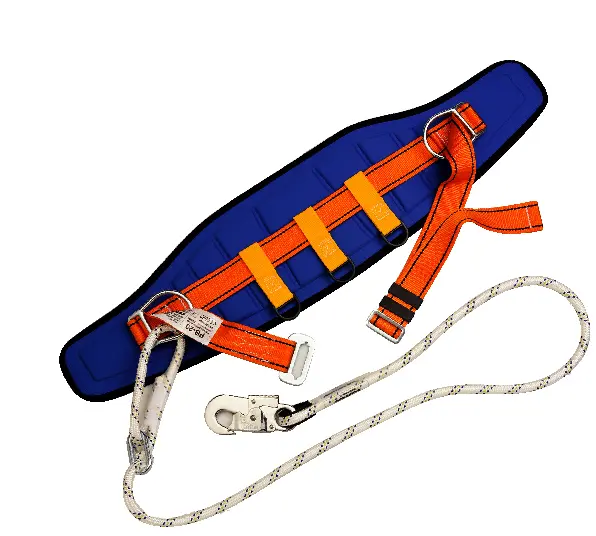 Pracovní polohavací pás s bederní výztuhou, polohovacími oky a sponou k seřízení velikosti, poutky k připojení brašny na nářadí, univerzálním bezpečnostním 1,5 m dlouhým lanem se seřizovačem a ocelovou karabinou s pojistkou.