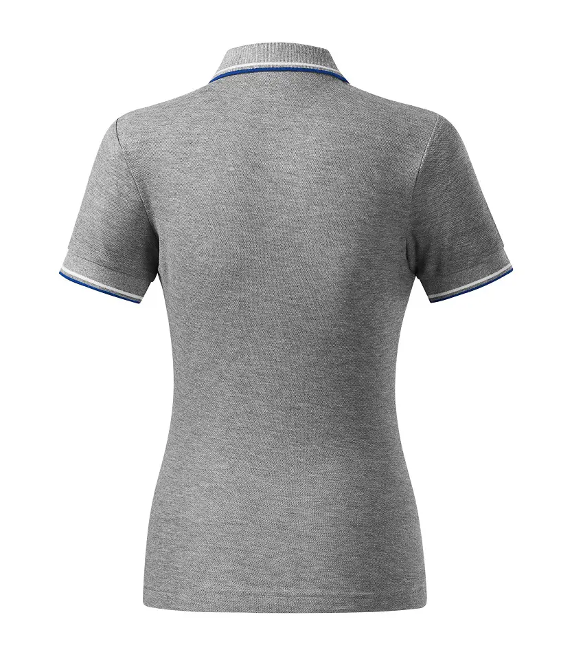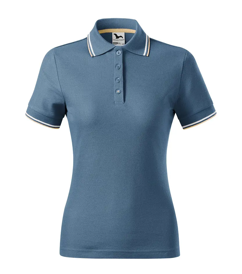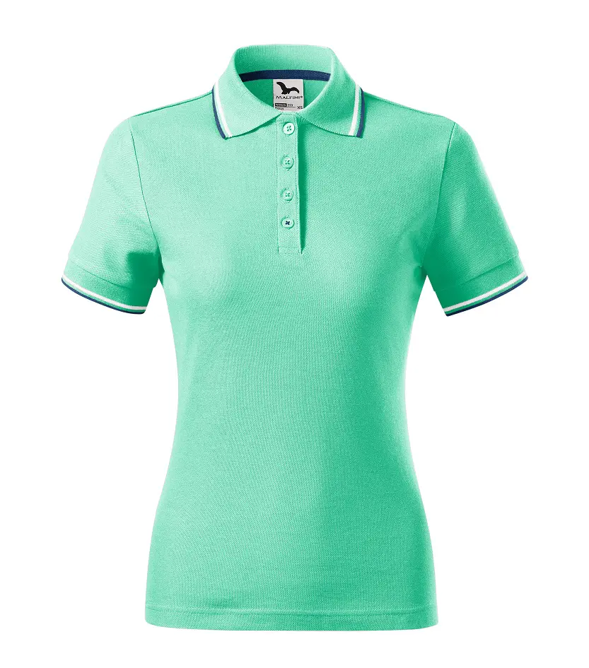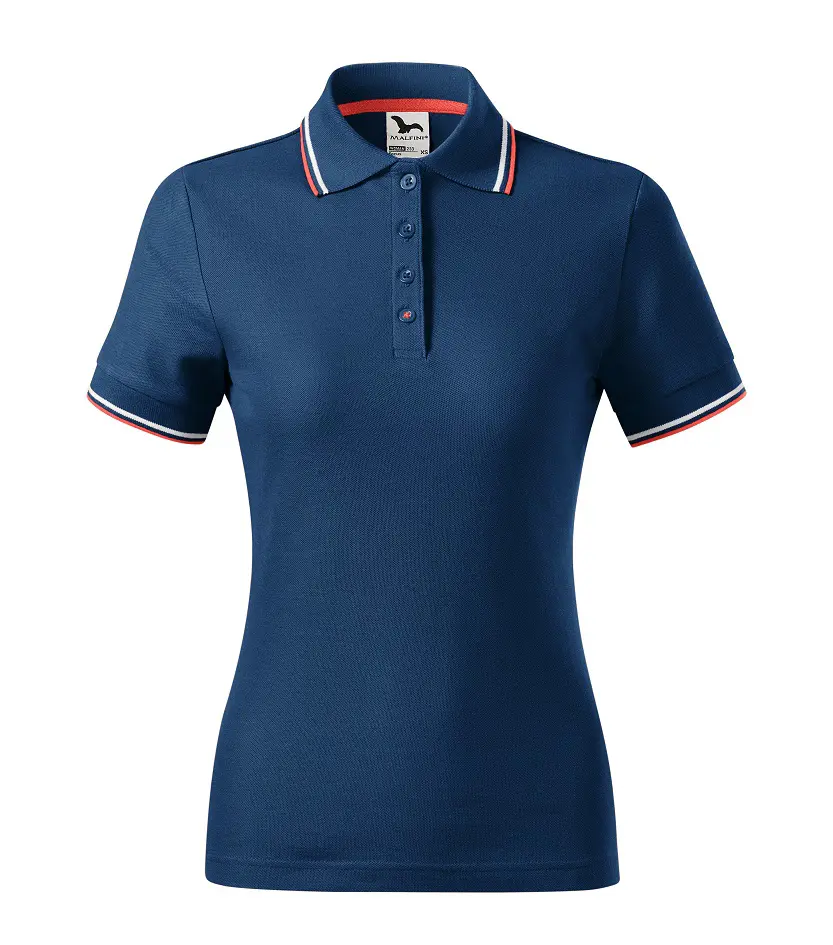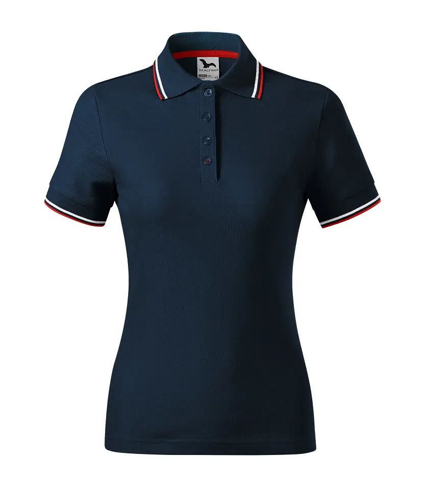 Polokošile dámská, lehce vypasovaný střih s bočními švy, límeček z žebrového úpletu 1:1, 2 kontrastní proužky na rukávu a límečku, úzká léga s 4 knoflíčky v barvě materiálu, spodní knoflíček přišitý kontrastní nití, vnitřní průkrčník začištěn kontrastní páskou, zpevnění ramenních švů páskou, rozparky v bočních švech s kontrastní páskou. Materiál Pique, 65 % bavlna, 35 % polyester (barva 12 složení se může lišit - 85 % bavlna, 15 % viskóza). Vel. XS-XXL