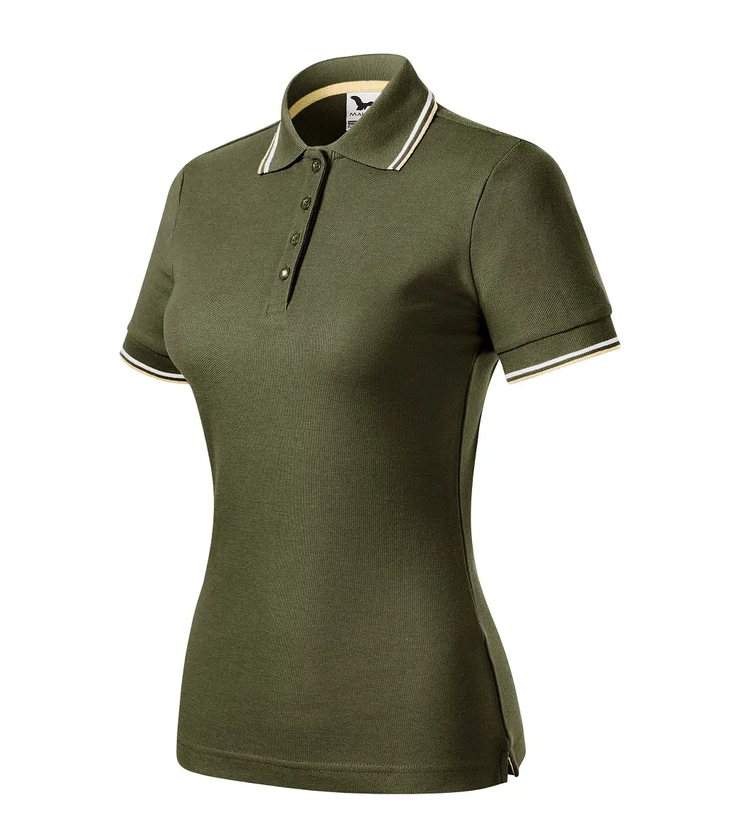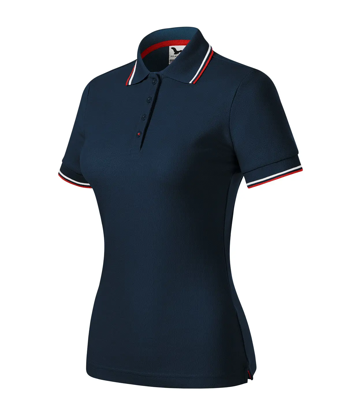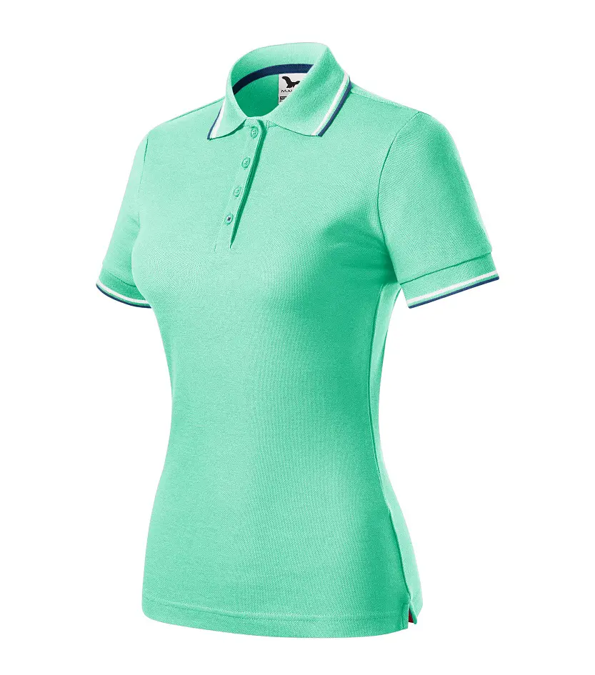 Polokošile dámská, lehce vypasovaný střih s bočními švy, límeček z žebrového úpletu 1:1, 2 kontrastní proužky na rukávu a límečku, úzká léga s 4 knoflíčky v barvě materiálu, spodní knoflíček přišitý kontrastní nití, vnitřní průkrčník začištěn kontrastní páskou, zpevnění ramenních švů páskou, rozparky v bočních švech s kontrastní páskou. Materiál Pique, 65 % bavlna, 35 % polyester (barva 12 složení se může lišit - 85 % bavlna, 15 % viskóza). Vel. XS-XXL