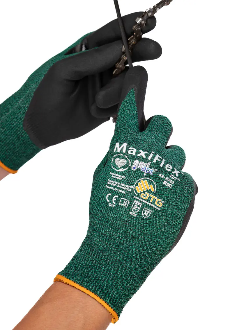 ATG® protiřezné rukavice MaxiFlex® Cut™ 42-8743 AD-APT®, celosvětově známé a oblíbené rukavice MaxiFlex® se staly měřítkem pro rukavice používané při přesné manipulaci v suchém prostředí, MaxiFlex® Cut™ splňují všechny atributy řady MaxiFlex® - odolnost, prodyšnost, komfort a čistotu. Odolnost proti prořezání dle EN 388 úroveň 3, neobsahují silikon, polomáčené, kompatibilní s dotykovými displeji = technologie TOUCH SCREEN, tloušťka dlaně: 0,8 mm, norma: EN 388 4331B, barva: zelená, máčení: nitrilová pěna, materiál: nylon / lycra / skelné vlákno, velikosti: 05,06,07,08,09,10,11,12