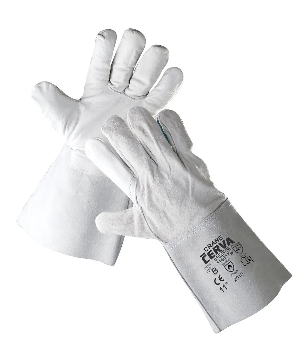 Celokožené rukavice z lícové hověziny v dlani, hovězí štípenky na hřbetu, s tuhou 15 cm širokou manžetou, bez podšívky. Certifikát: svářečské práce - typ B